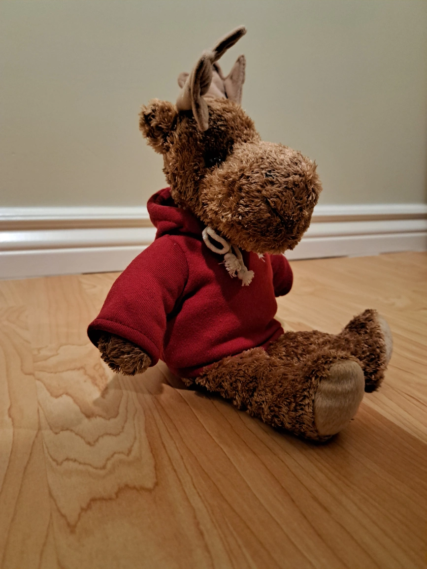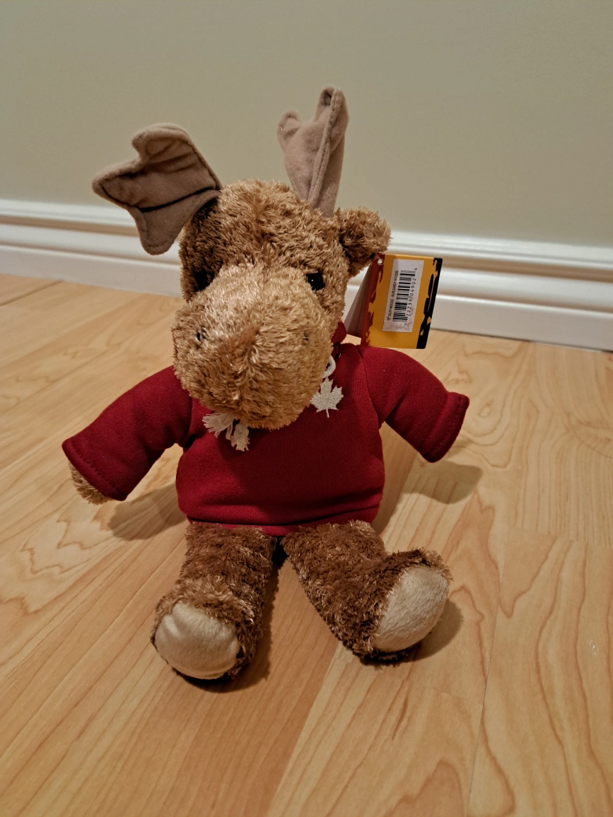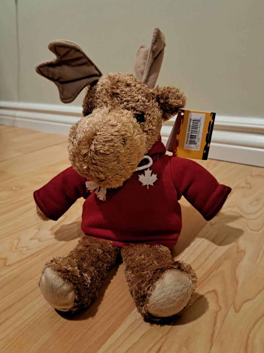 Cute plush moose wearing a red hoodie with a maple leaf and CANADA written on the back. Soft and cuddly, perfect for collectors or children. New with tags.