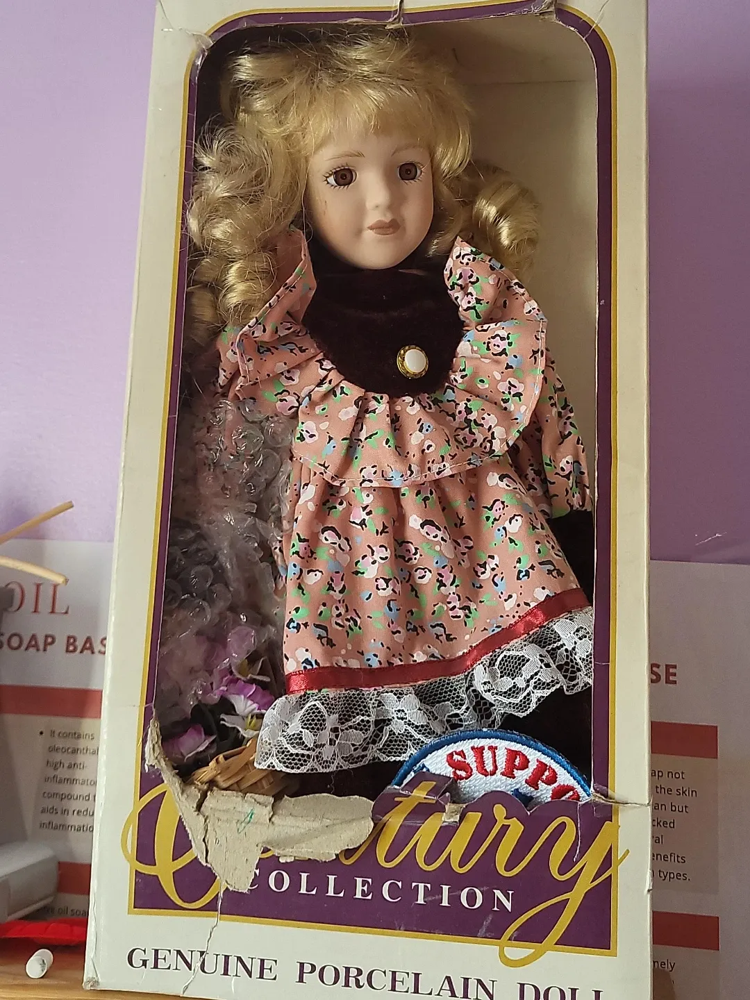 This is a genuine porcelain doll from the Century Collection. It's dressed in a floral print dress with lace trim. This collectible doll is presented in its original box, ready for display.