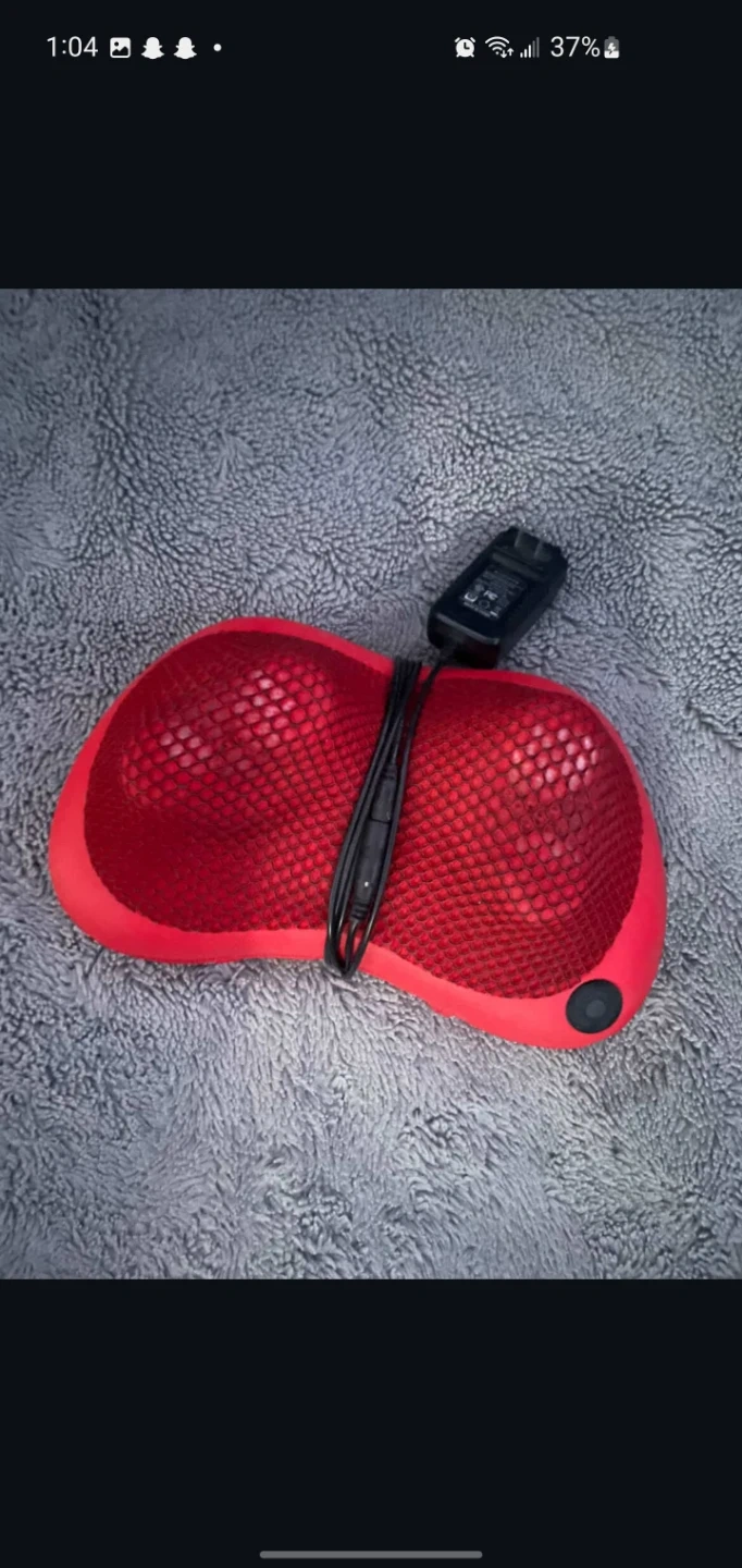 This red neck and back massager pillow features a mesh fabric. It has straps to secure it in place. Power adapter included. Great for soothing muscle tension after a long day!
