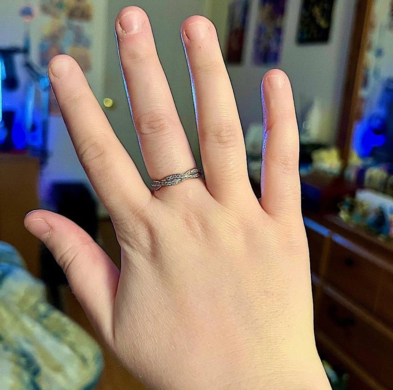 This is a sterling silver ring which features a rose gold band with pave cubic zirconia stones set around. The ring is size 7.