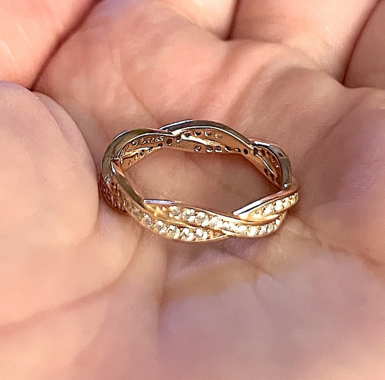 This is a sterling silver ring which features a rose gold band with pave cubic zirconia stones set around. The ring is size 7.
