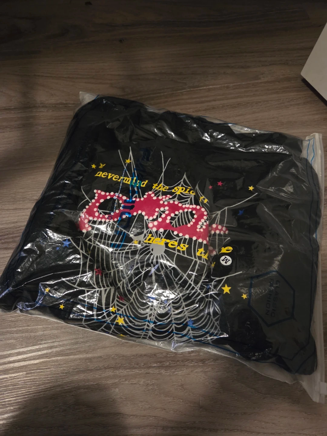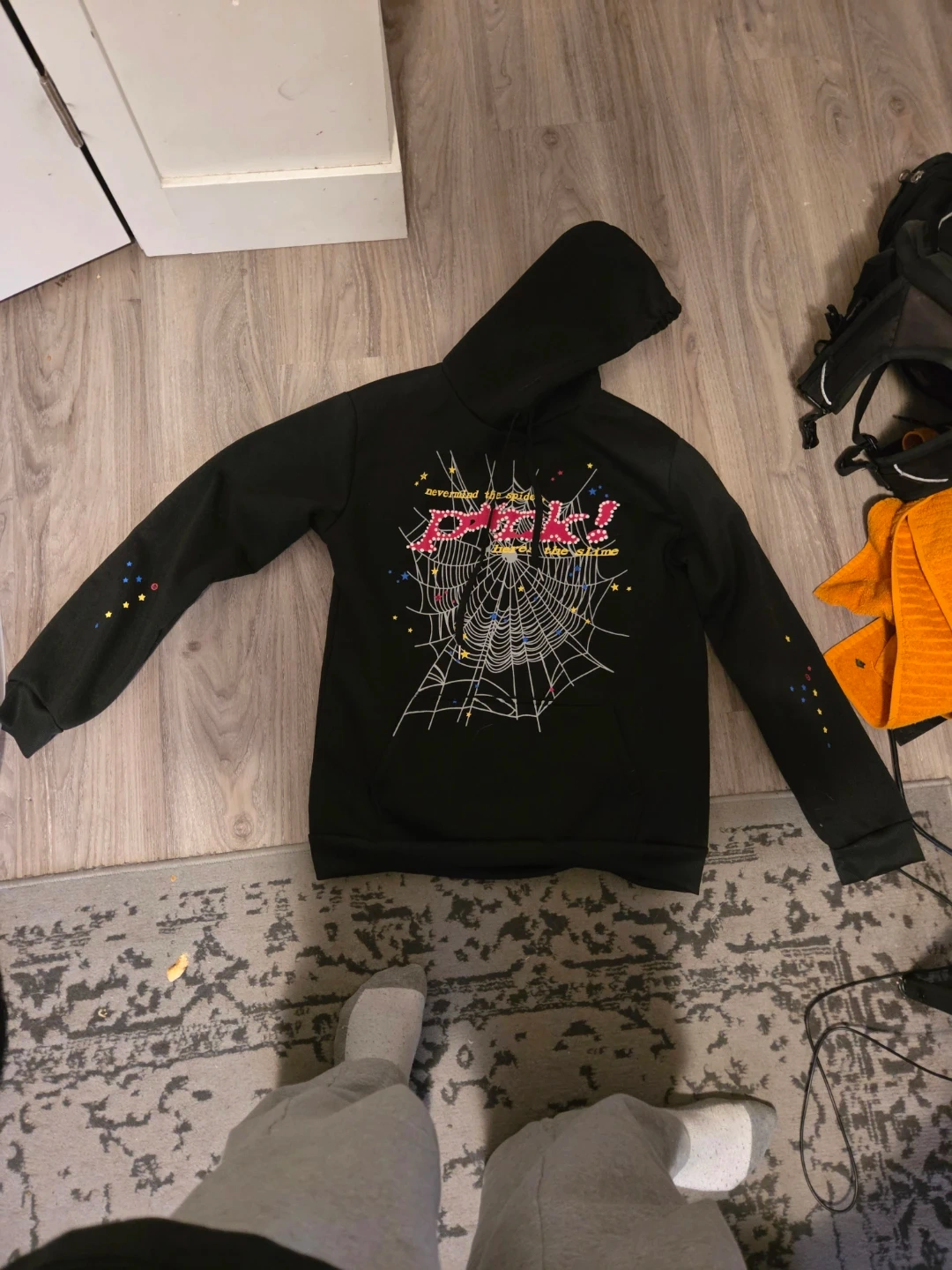 Black hoodie with a spider web graphic and text that reads 'nevermind the spiders'. It's size medium. The back has a yellow star graphic. Cash only pick up in st albert