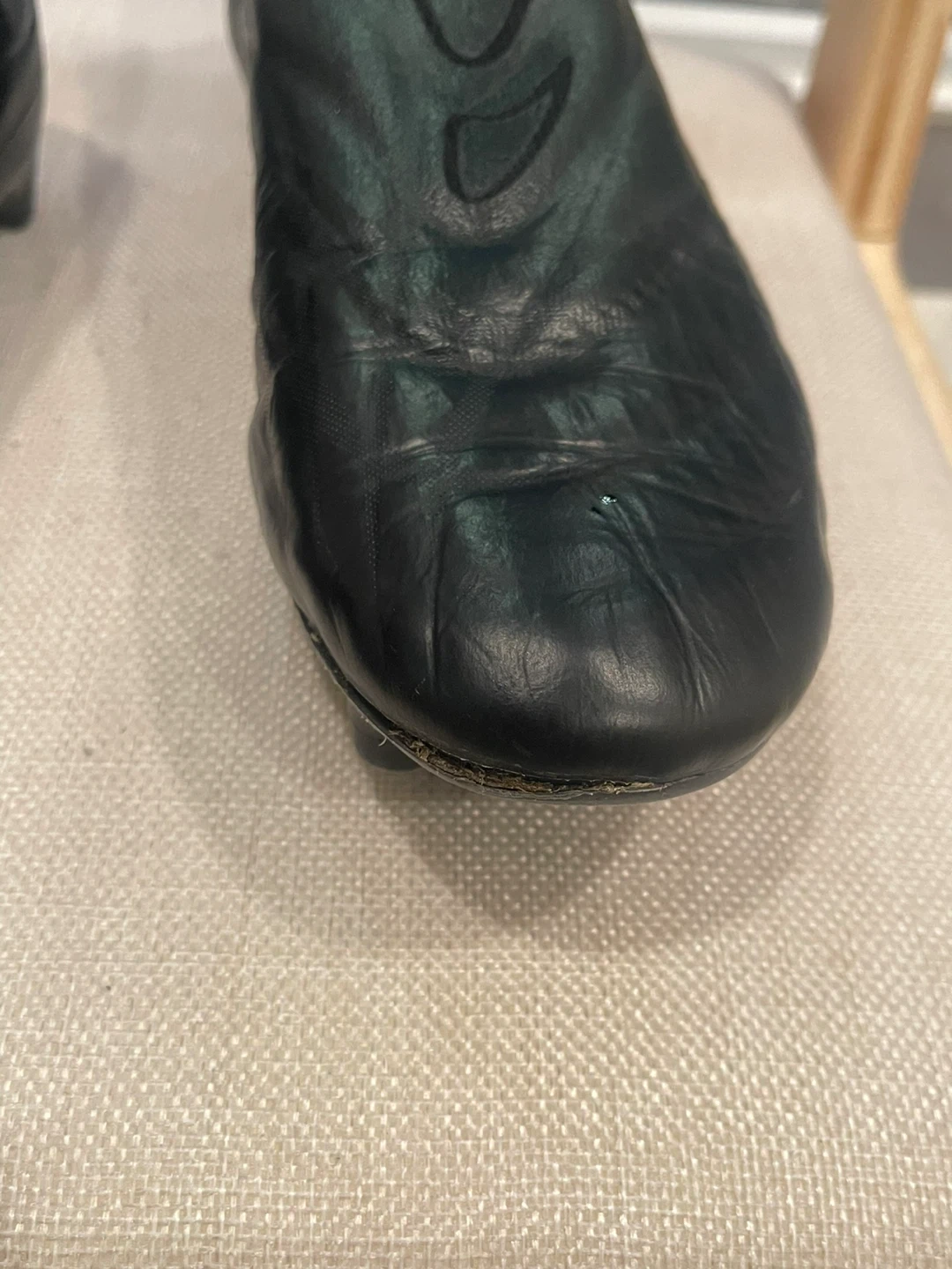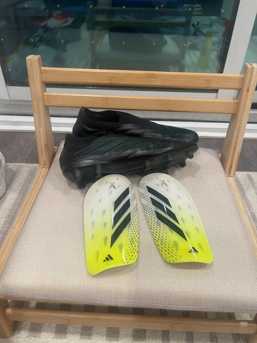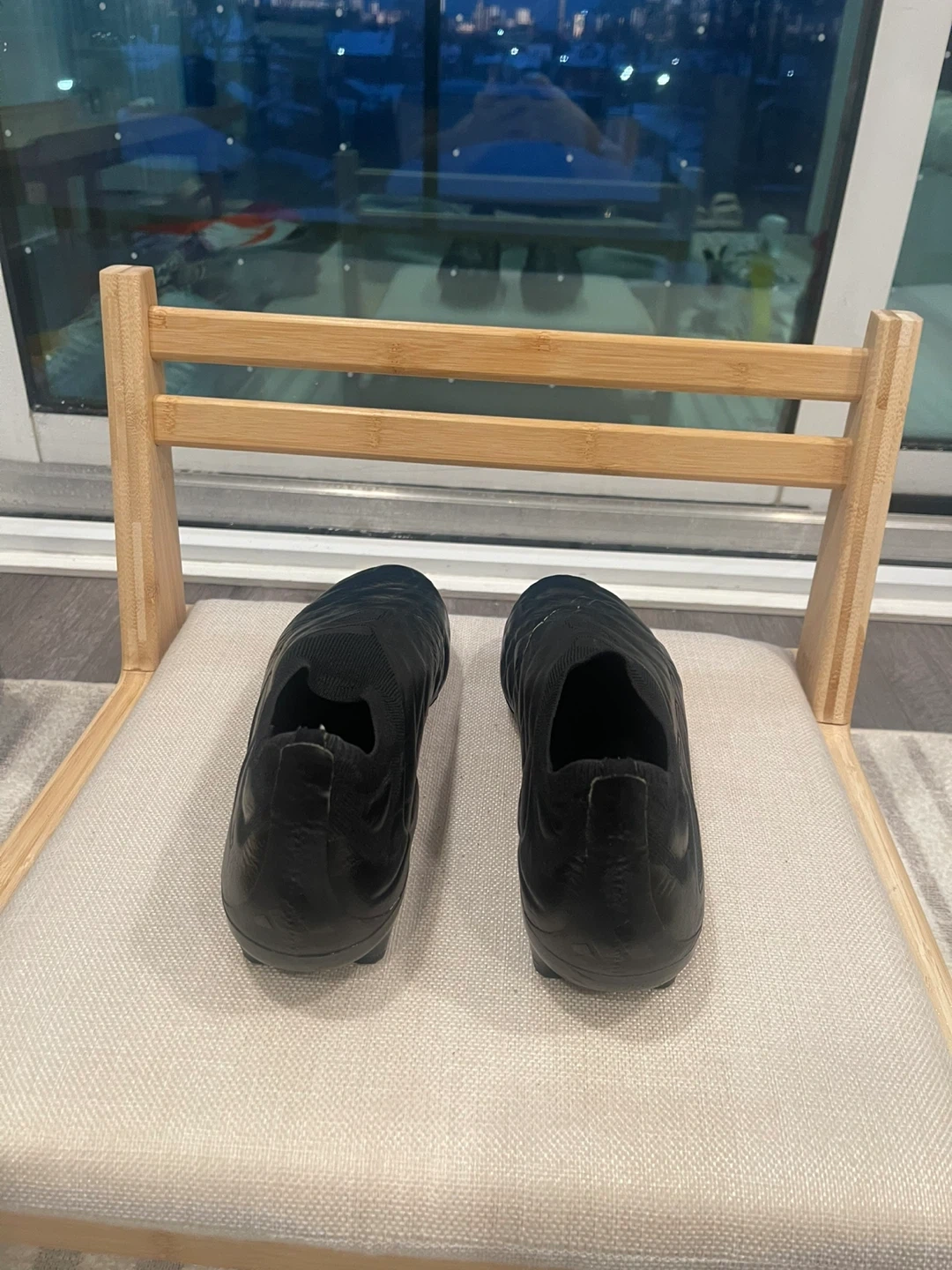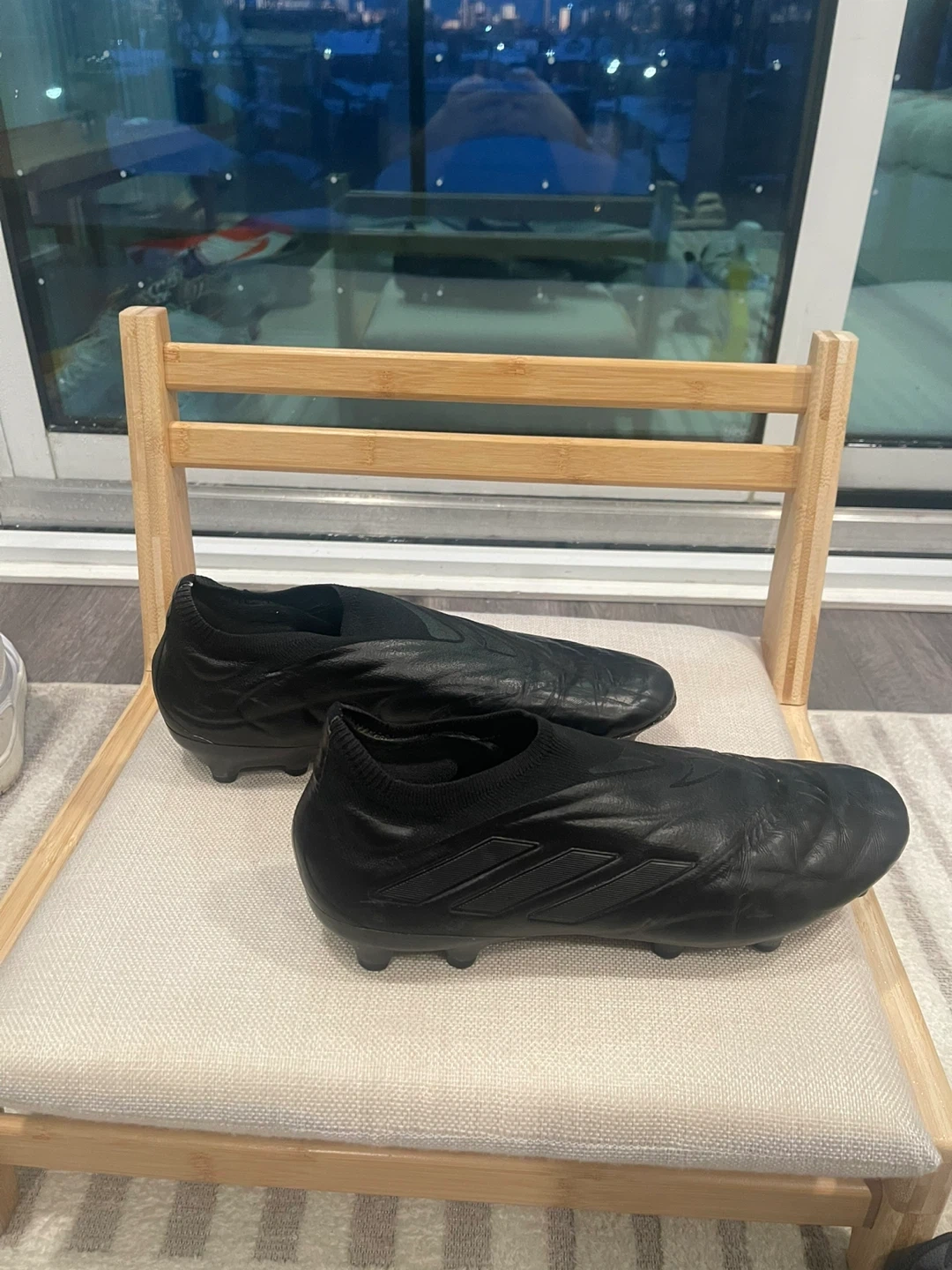 Black Adidas football cleats. Designed for soccer performance. It's a black, low-top cleat with a sock-like collar. These cleats have a durable outsole with firm ground studs.