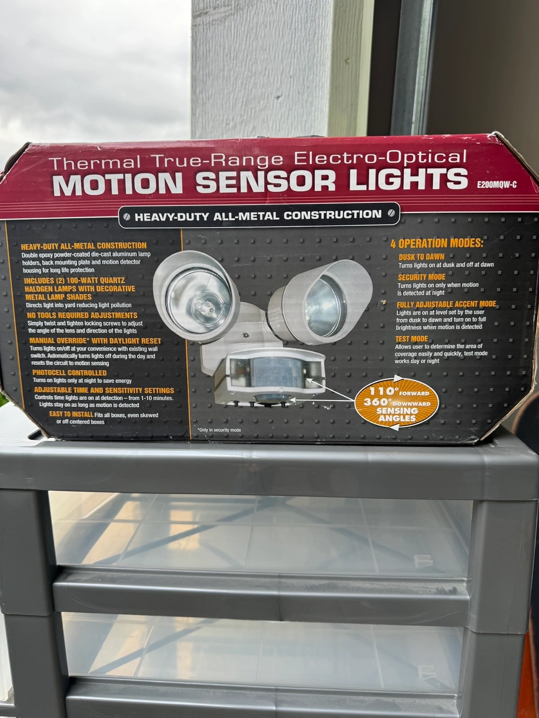 Heavy-duty all-metal construction. 4 operation modes: Dusk to dawn, Security Mode, Fully Adjustable Accent Mode, Test Mode. Includes two 100-watt quartz halogen lamps with decorative lamp shades. 360° full coverage, 110° forward sensing angle. Easy to install.