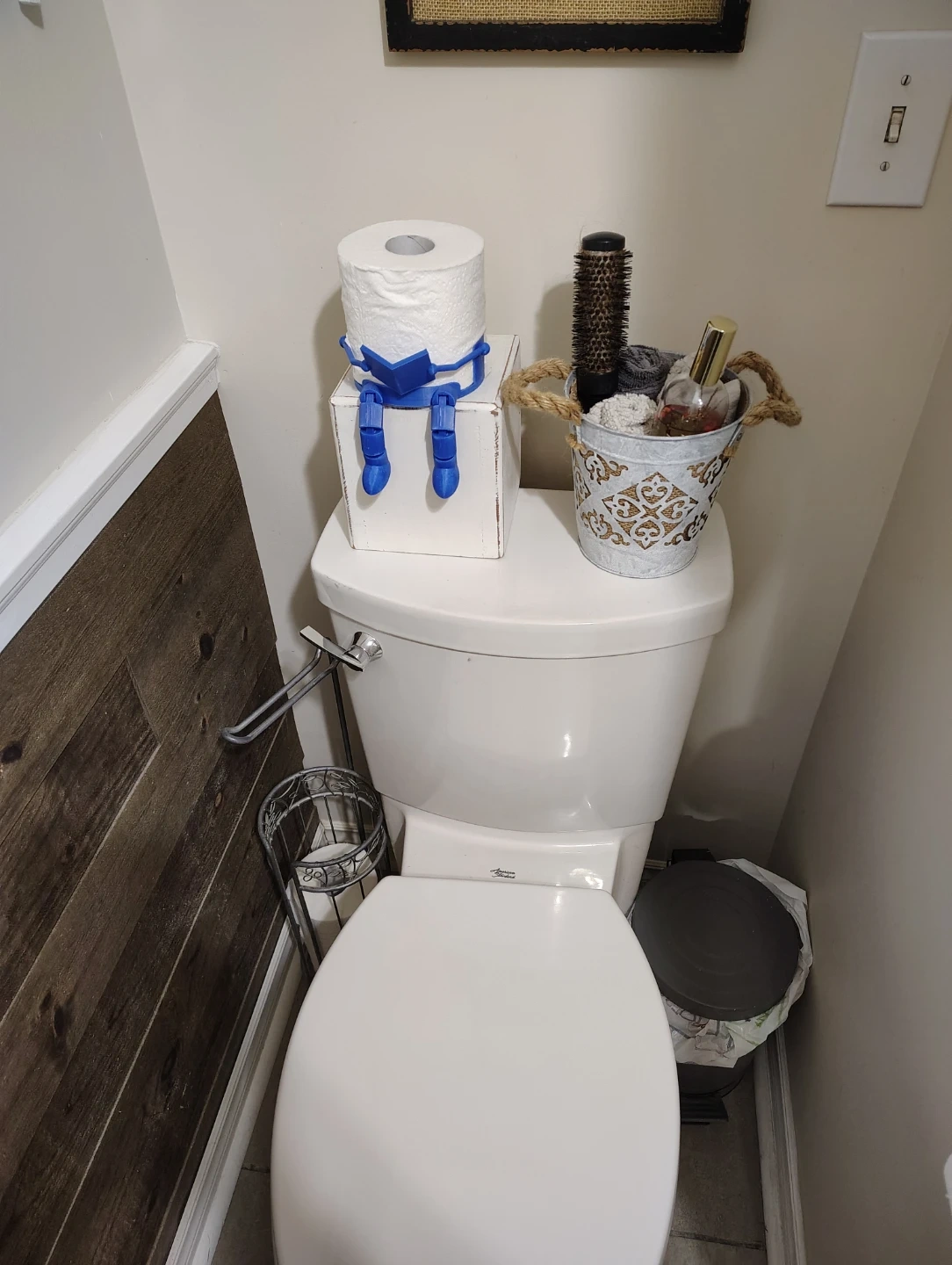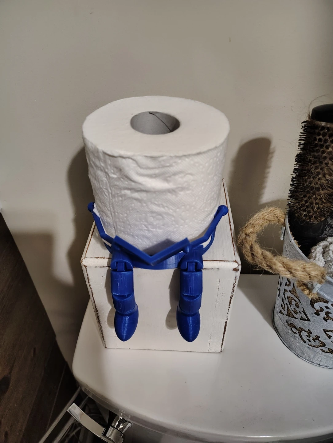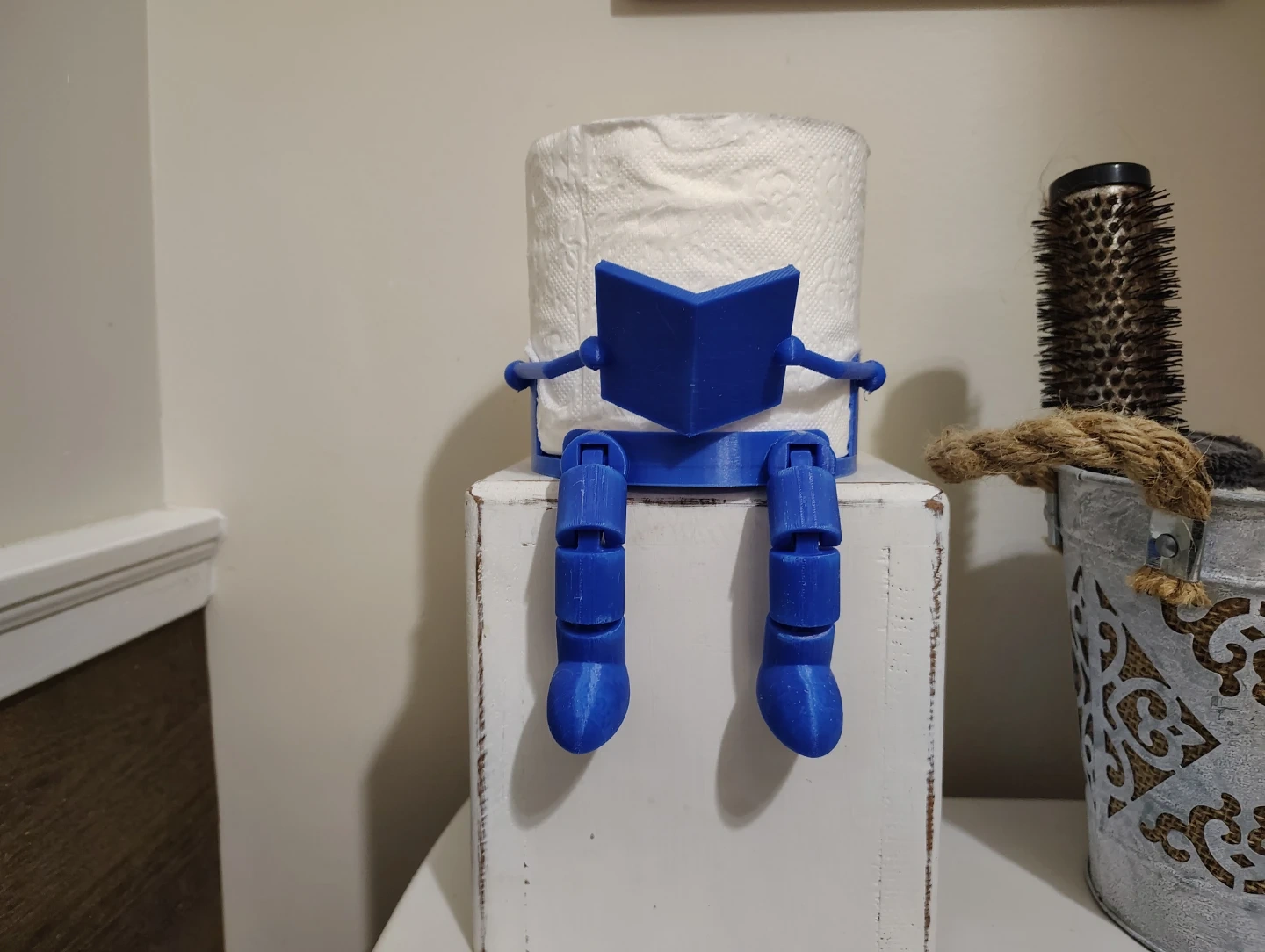 This quirky toilet paper holder features a blue, articulated figure sitting and reading. It's a fun and unique addition to any bathroom. The holder is designed to accommodate a standard-sized toilet paper roll.