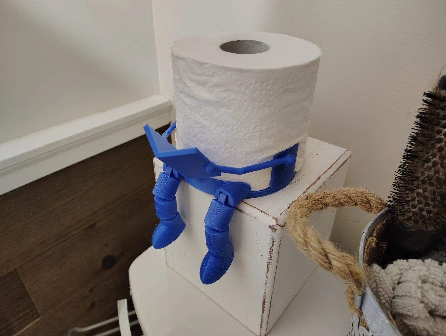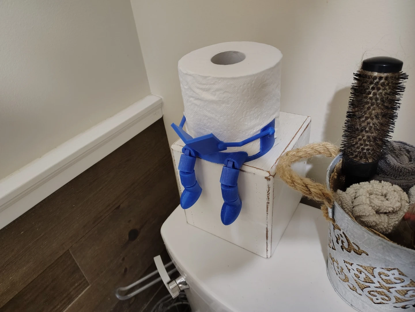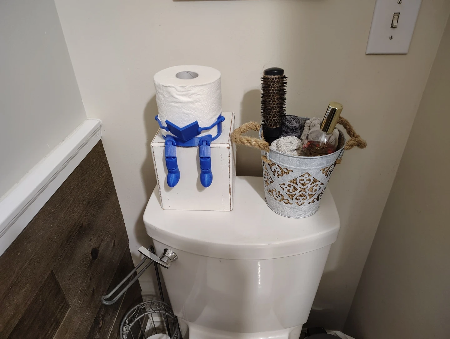 This quirky toilet paper holder features a blue, articulated figure sitting and reading. It's a fun and unique addition to any bathroom. The holder is designed to accommodate a standard-sized toilet paper roll.