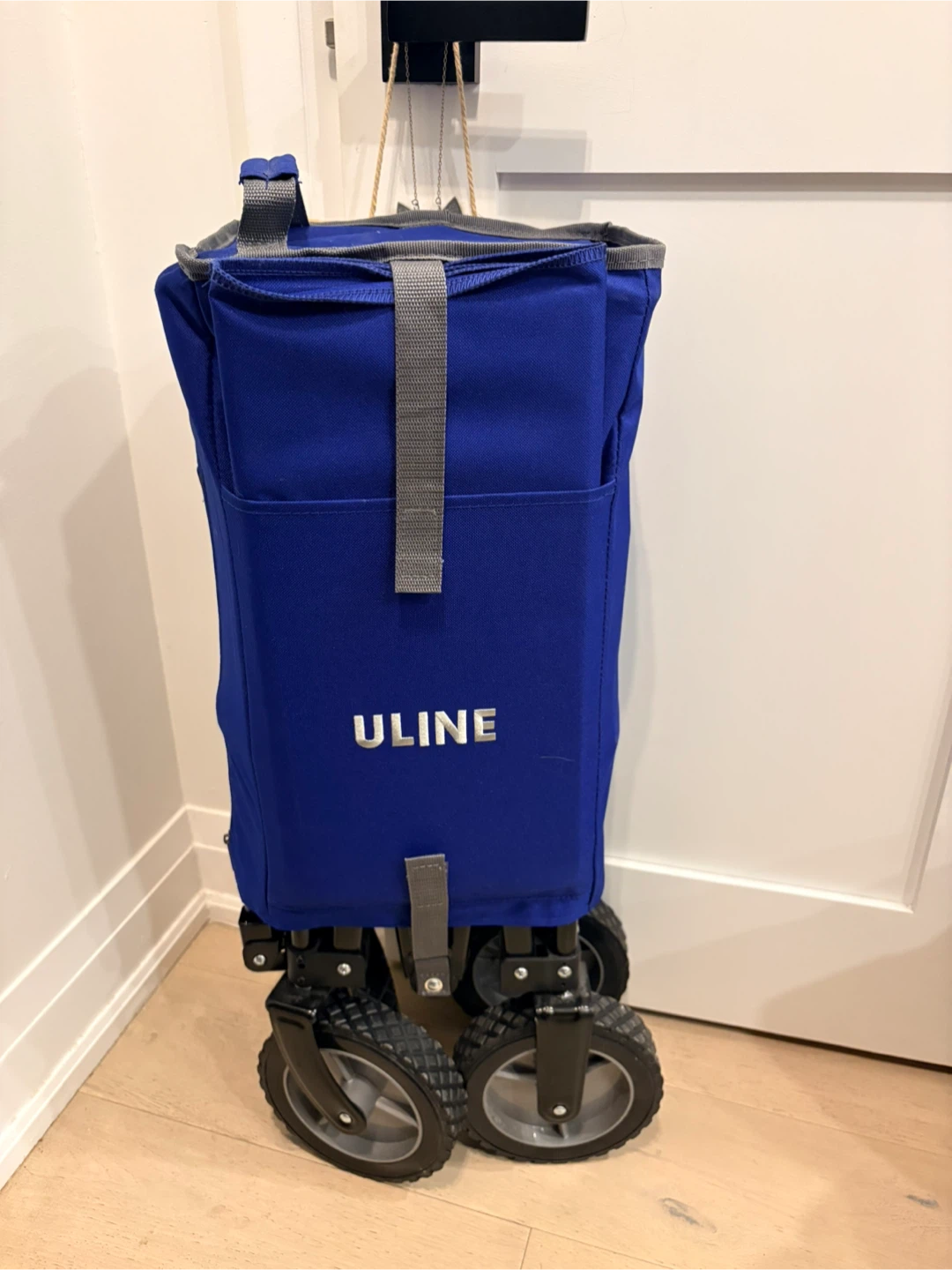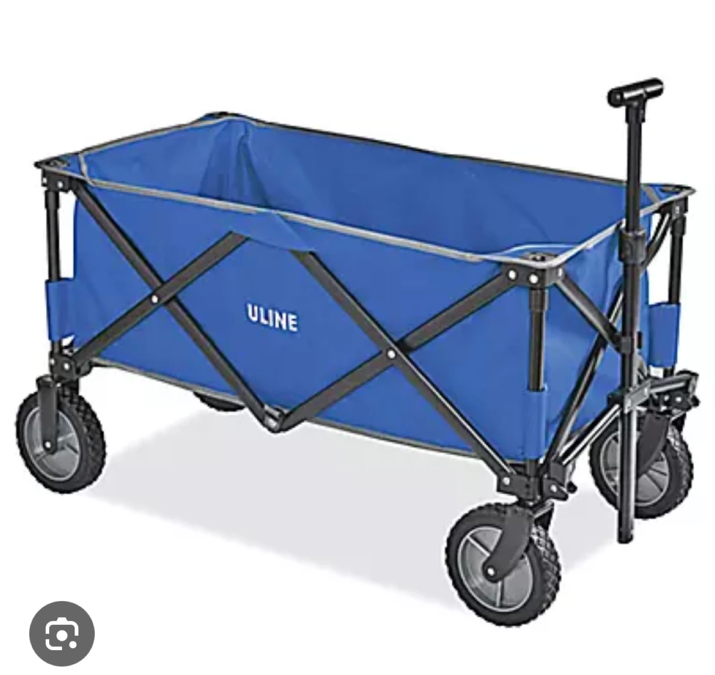 Uline utility wagon in blue. It's a foldable wagon with a capacity of 180 lbs. This wagon is perfect for hauling gear to the beach or sports events!