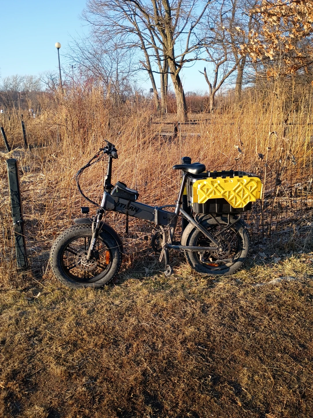 This VOTILAN V3 is an electric folding fat tire bike. It's equipped with a large rear cargo basket, perfect for hauling groceries or gear! The fat tires provide excellent traction and a smooth ride on various terrains.