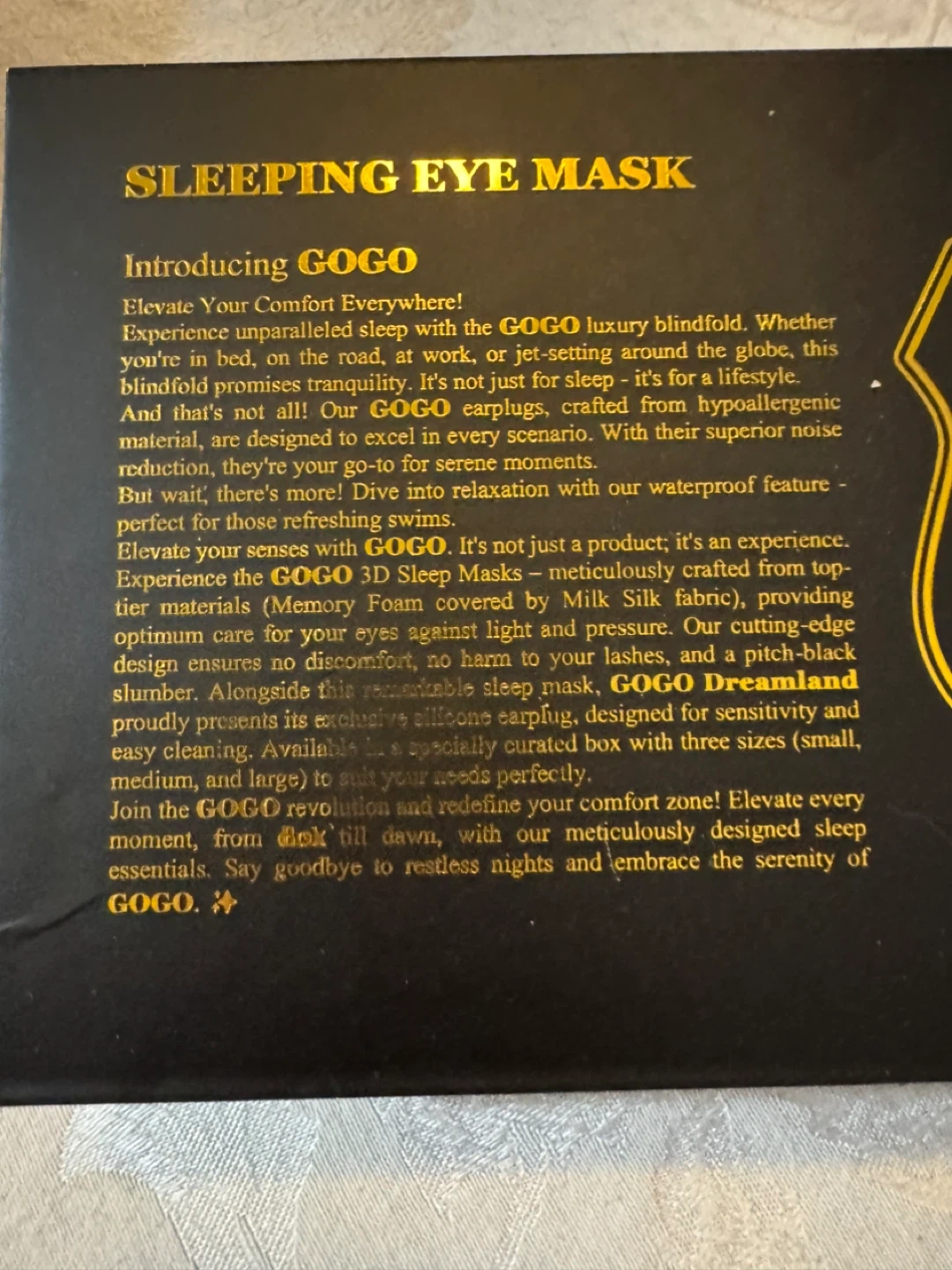 Selling a new GOGO Dreamland sleeping eye mask! It also comes with hypoallergenic earplugs crafted from hypoallergenic material. The mask is meticulously crafted from top-tier Memory Foam covered by Milk Silk fabric, providing optimum care for your eyes against light and pressure. It comes in a specially curated, sealed box with the mask, three sizes of earplugs (small, medium, and large), and a small cloth bag to hold the items that will suit your needs perfectly. Retails online currently for up to $29.99.