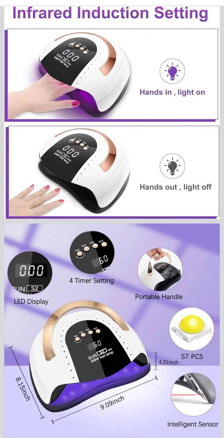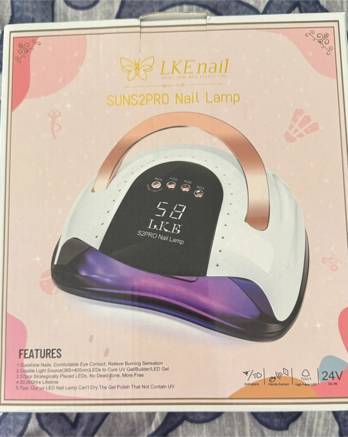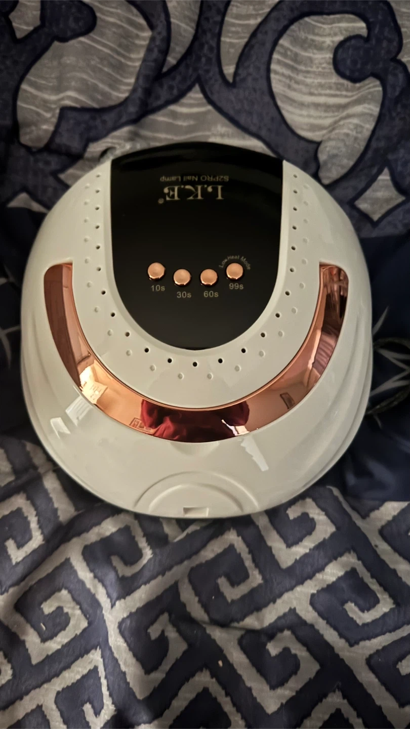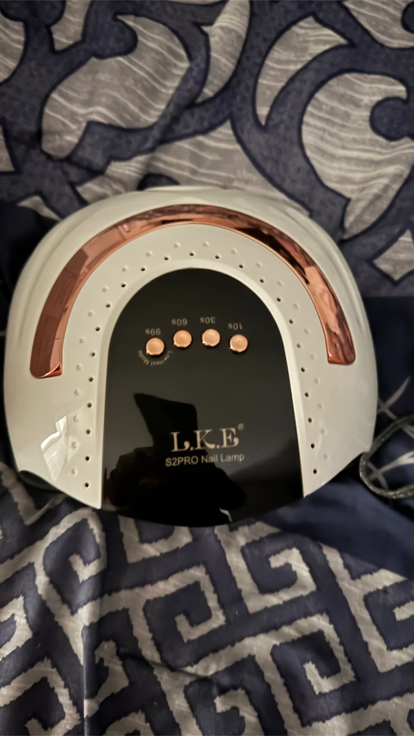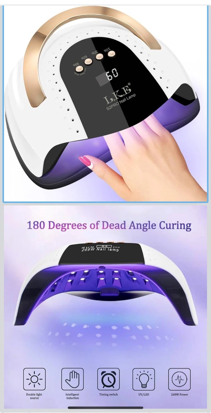 LKE S2PRO nail lamp is white with rose gold accents. High power 268W device has 57 strategically placed LEDs and a double light source for curing UV and LED gels. Unit features four timer settings at 10s, 30s, 60s, and a 99s low heat mode. Digital display shows curing time and built-in infrared sensor allows for automatic operation when hands are inserted.