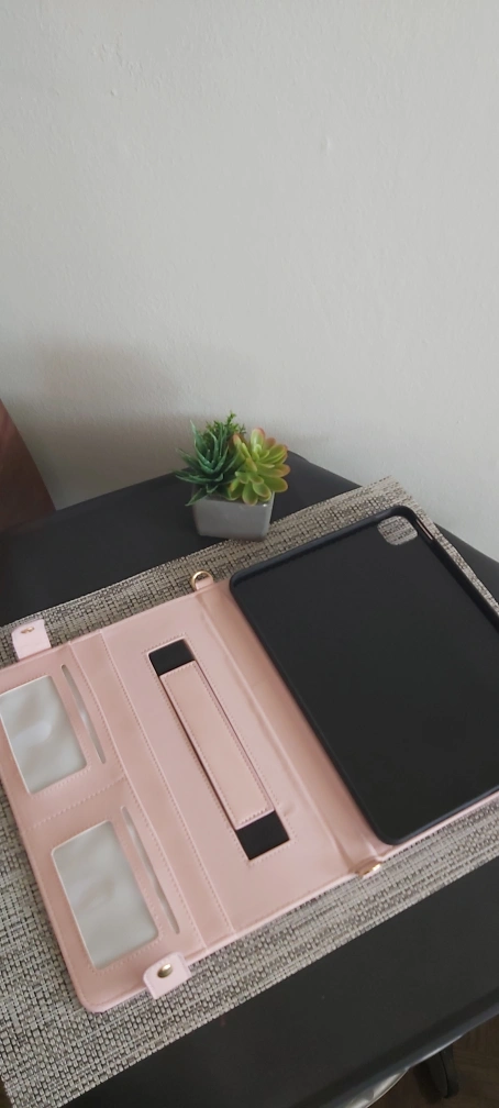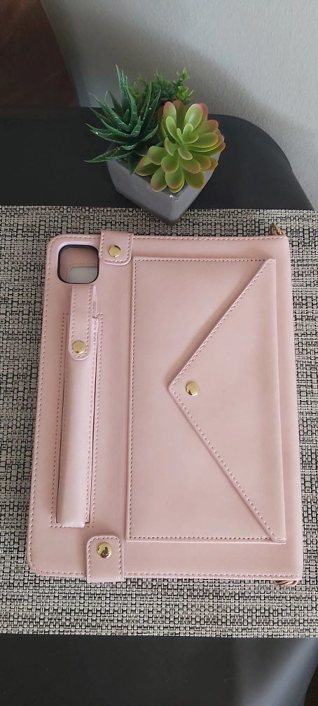 Stylish pink iPad case. Features a detachable shoulder strap, multiple card slots, and a pen holder. Envelope-style flap closure. Perfect for organization and on-the-go use.