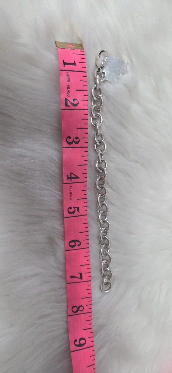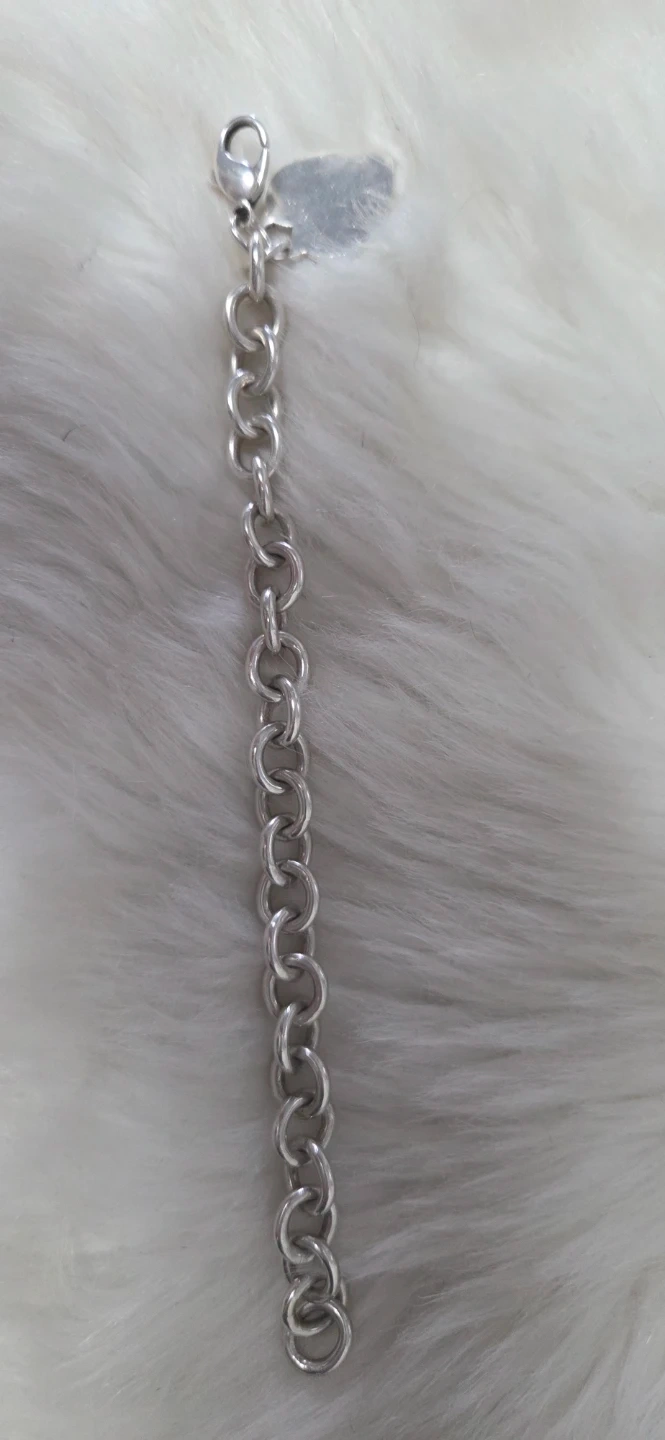 This is a Tiffany & Co. Inspired sterling silver heart tag bracelet. It measures approximately 7.5 inches long. The bracelet is made of sterling silver.