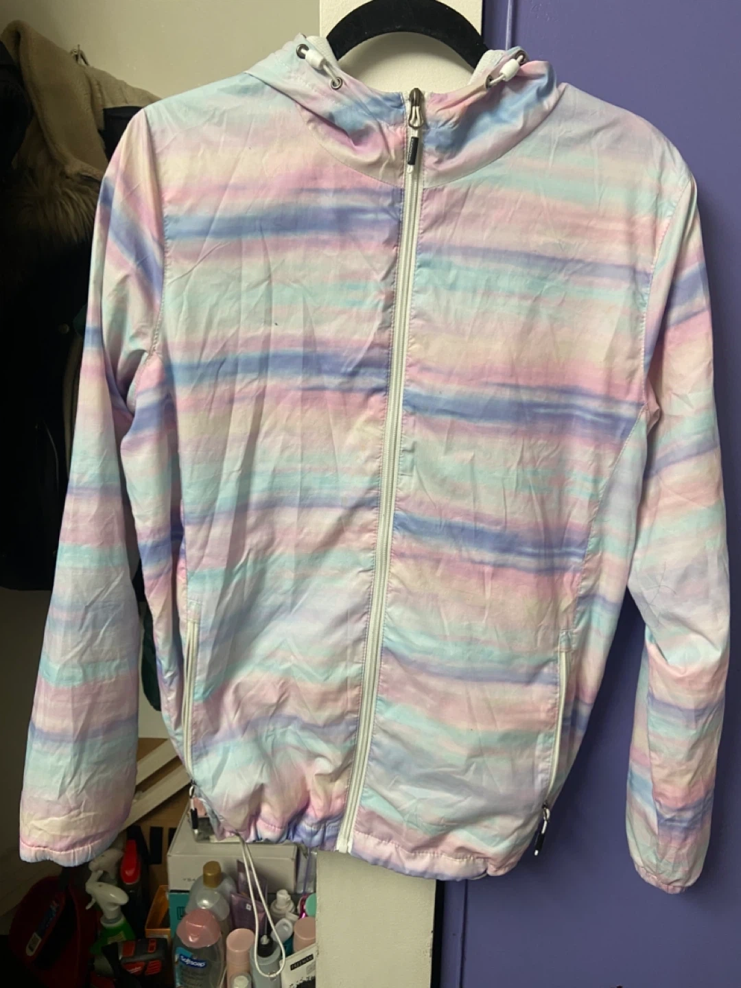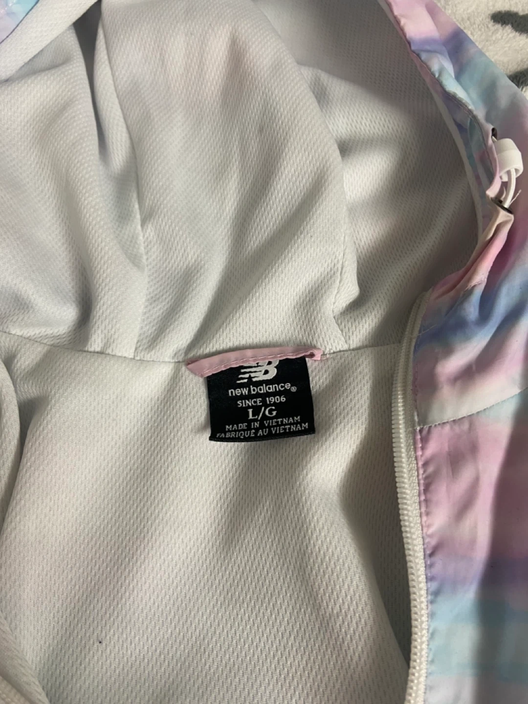 New Balance lightweight hooded jacket with a pastel stripe pattern. Size is L/G. Made in Vietnam. It's a great windbreaker for cooler days!