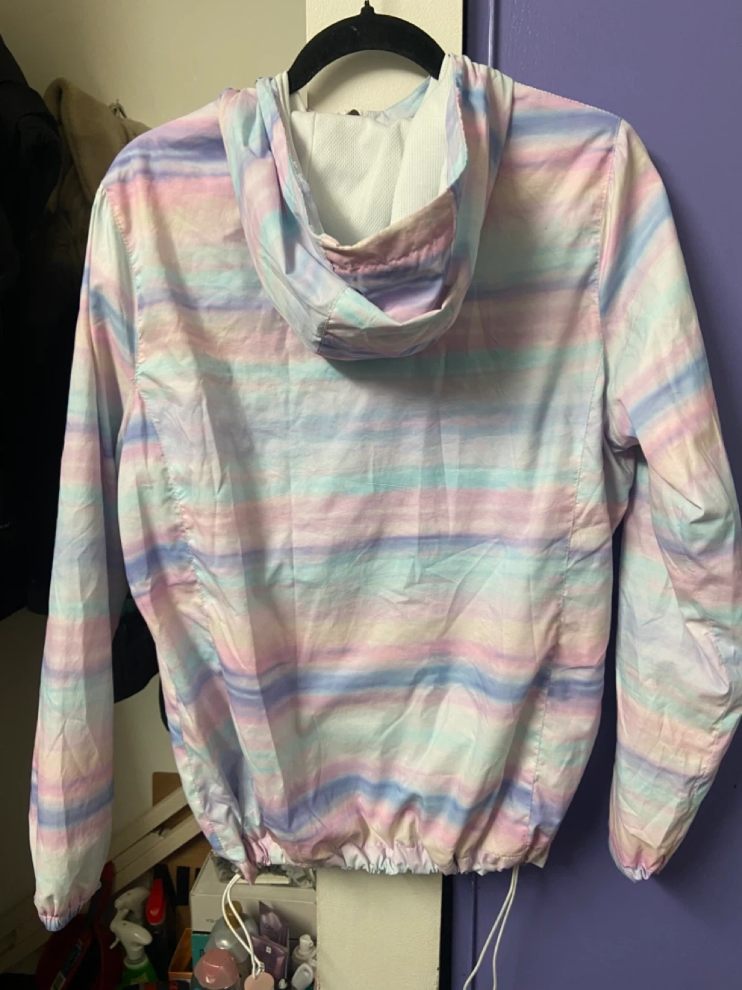 New Balance lightweight hooded jacket with a pastel stripe pattern. Size is L/G. Made in Vietnam. It's a great windbreaker for cooler days!