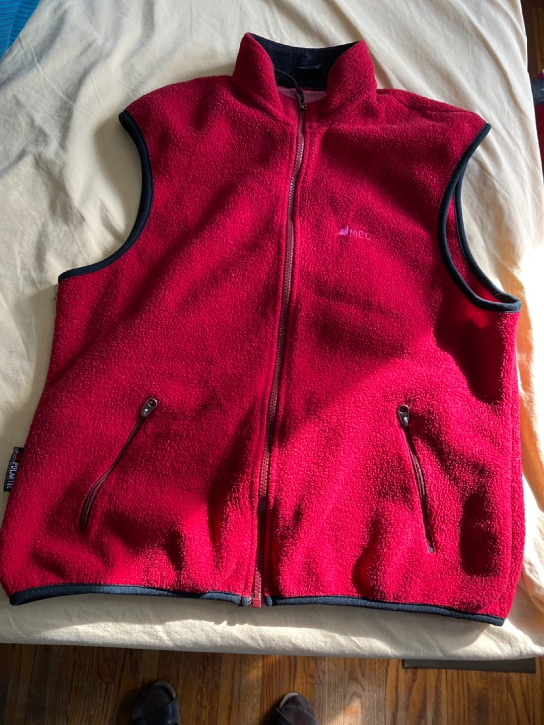 This is a MEC red fleece vest. It's made of polyester fleece material. It has zippered pockets and a full zip front. A great layering piece for cooler weather! Size s/m women’s