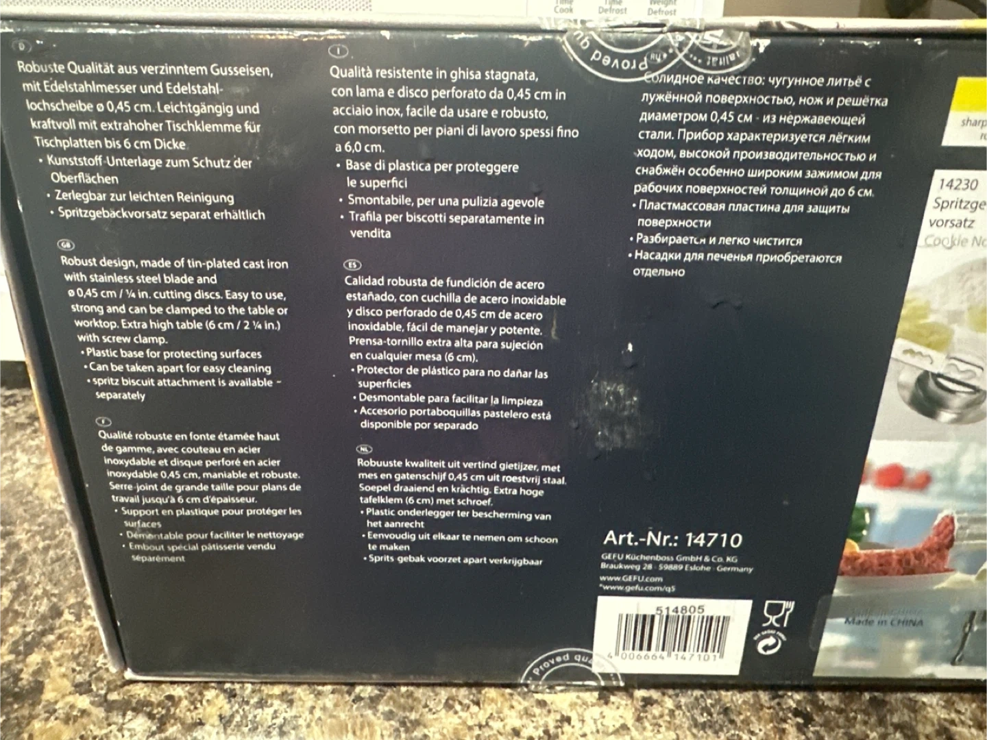I'm selling a Gefu Meat Mincer! It's in like new condition and comes with the box. This mincer is designed with robust quality in tin-plated cast iron with a stainless steel blade. It can be easily clamped to tables up to 6 cm (2 1/4 in) with a screw clamp. Also includes a plastic base for protecting surfaces and a spritz biscuit attachment that is available separately