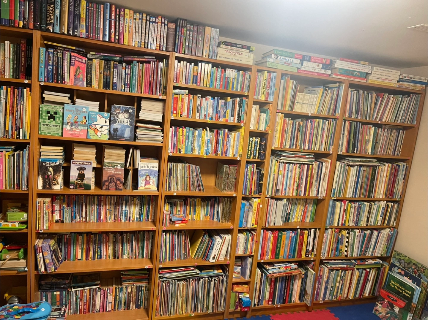 Clifford, Curious George, Mercer Meyer, Beatrice Potter, Dr. Suess, Robert Munsch, Step into Reading books, Sandra Boynton, Karen Katz, Early Readers Library books, Berenstein Bears, DORA, Diego, Baby Einstein, Amelia Bedelia, Barbie, Strawberry Shortcake, Care Bears, Franklin, Fairy tales, Nursery Rhymes, Barney, The Backyardigans, Paw Patrol, Peppa Pig, Sesame Street, Winnie the Pooh, Eric Carle, many Disney titles, many Scholastic books and many, many, many others.