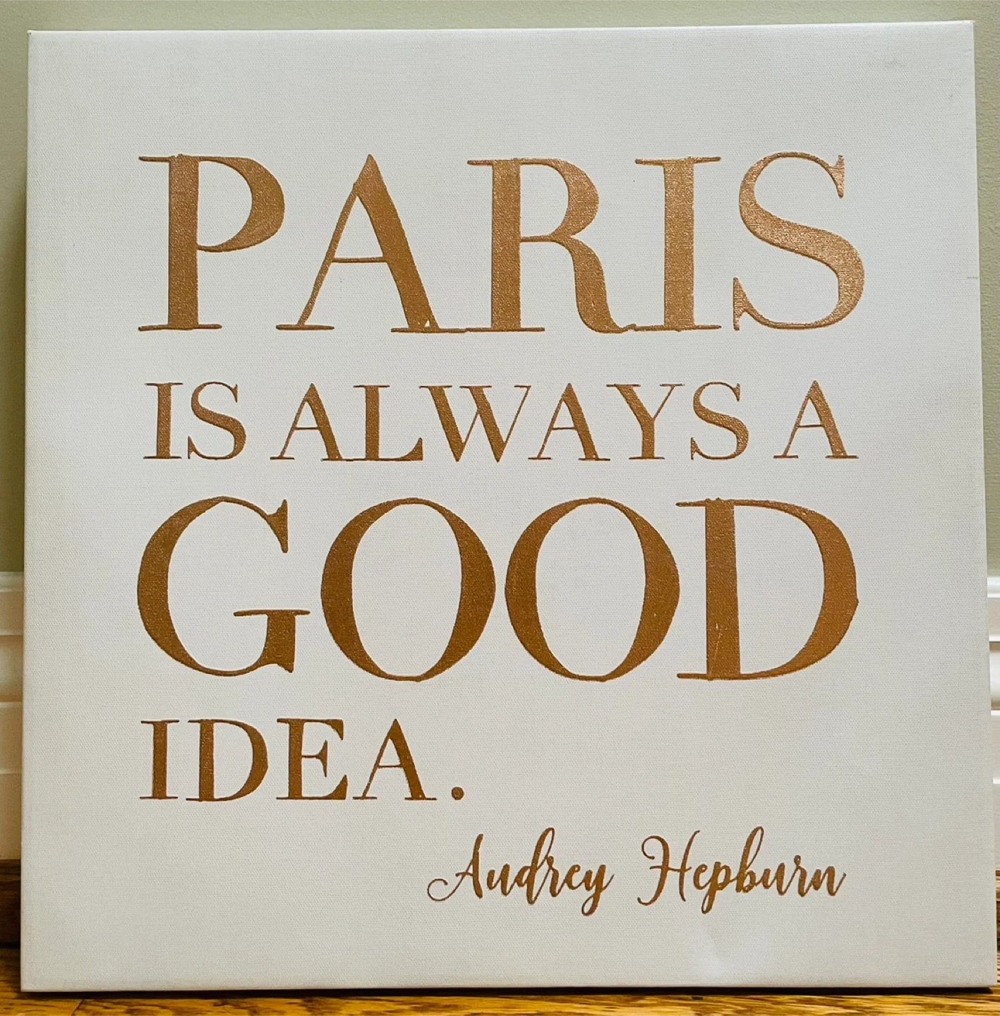 This canvas art features the quote "Paris is always a good idea." attributed to Audrey Hepburn. It's printed in a metallic gold font on a white canvas. Simple and elegant home decor.