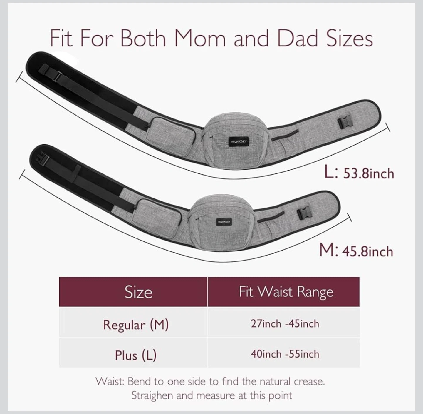 Grey hip seat baby carrier with multiple pockets for easy trips. It features a widened EVA belt for weight distribution and belly protection. Offers 4 carrying positions for comfort.