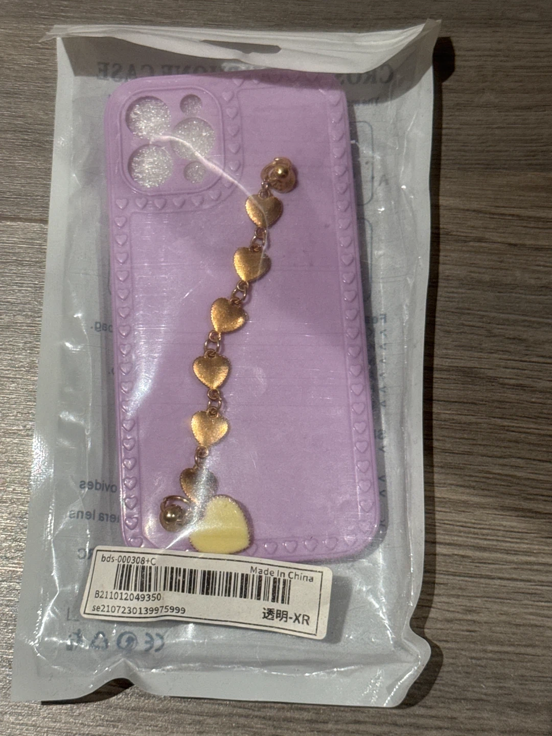 This is a phone case with a gold heart-shaped charm. It's made of a soft, flexible material and has a purple hue. The case is designed for the iPhone XR.