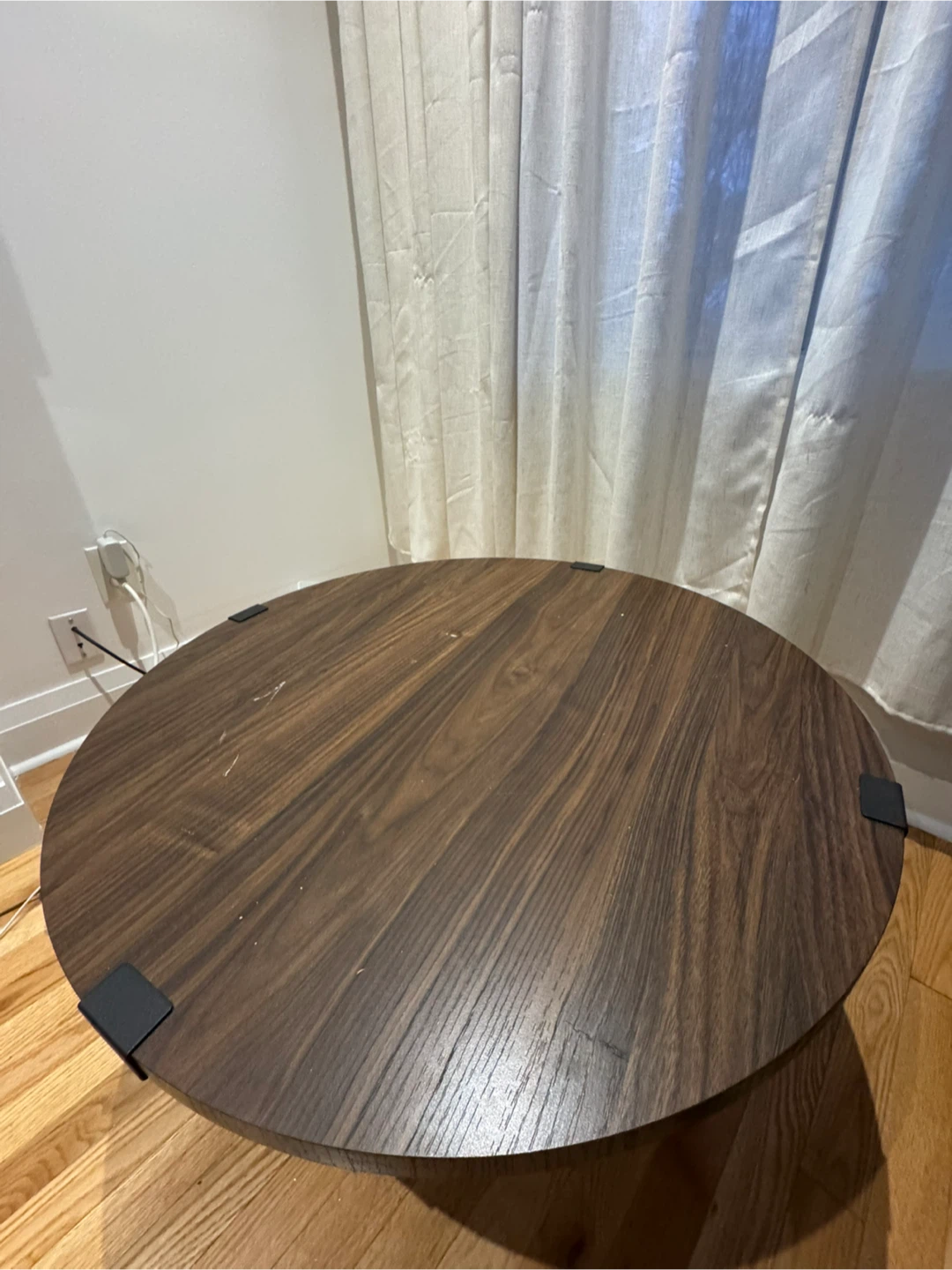 Selling a round wooden coffee table. It has a nice dark wood grain finish and black metal accents on the legs. It's in good condition and would be a great addition to any living room or den