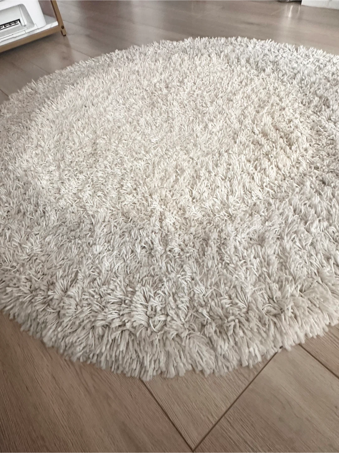 Cozy round shaggy rug in a soft cream colour. It's a plush and comfortable addition to any room! Clean and provides a warm touch to your floor. Good for living spaces or bedrooms.Pet and smoke-free.