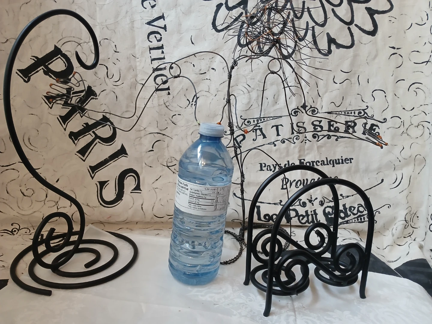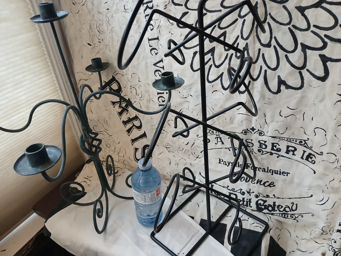 Four beautiful wrought iron accessories: napkin holder, wine rack, banana holder and candelabra. Change up your decor for Spring.