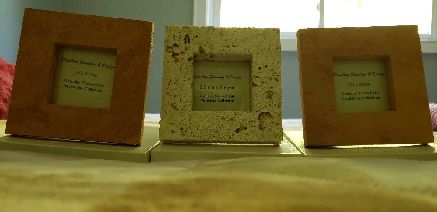 The frame size is 5.5cm x 5.5cm. one genuine white-fossil limestone collection and two genuine terra-cotta sandstone. comes with the box. Hand crafted!