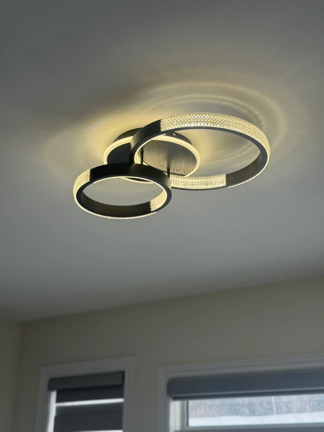 This contemporary flush mount ceiling light features a unique interlocking ring design with sparkling crystal accents. It's a stylish addition to any room, providing a warm glow. The fixture is made of durable metal with a black finish. It's suitable for living rooms, bedrooms, or hallways.