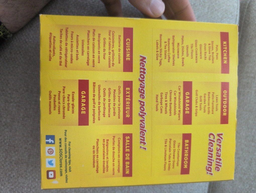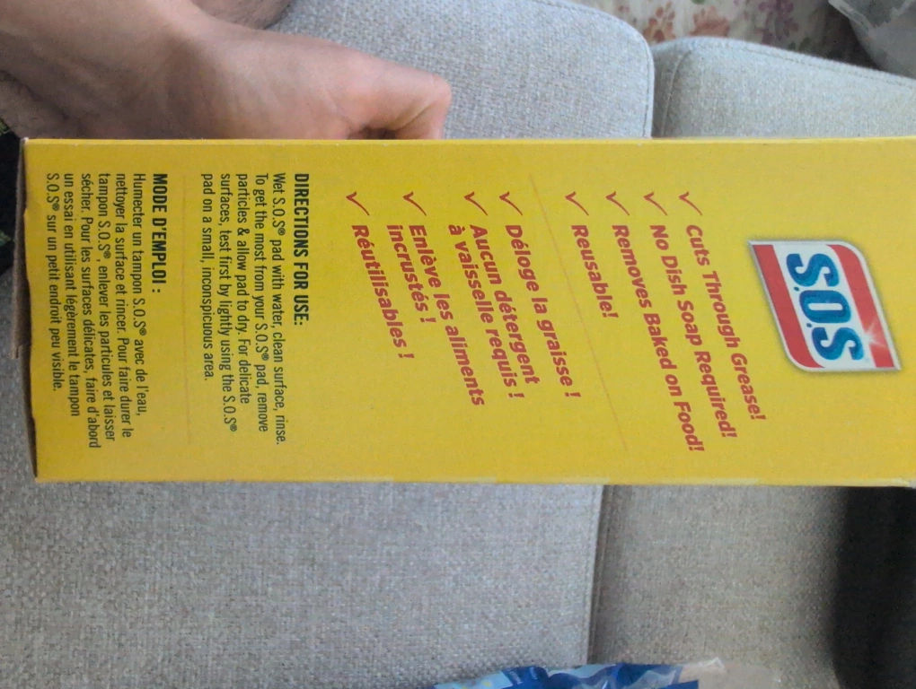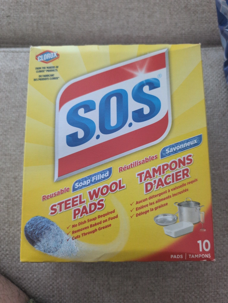 Selling a box of S.O.S Steel Wool Pads. Each pad is soap filled and reusable. Great for cleaning dishes, cookware, and even outdoor grills! The box contains 10 pads.