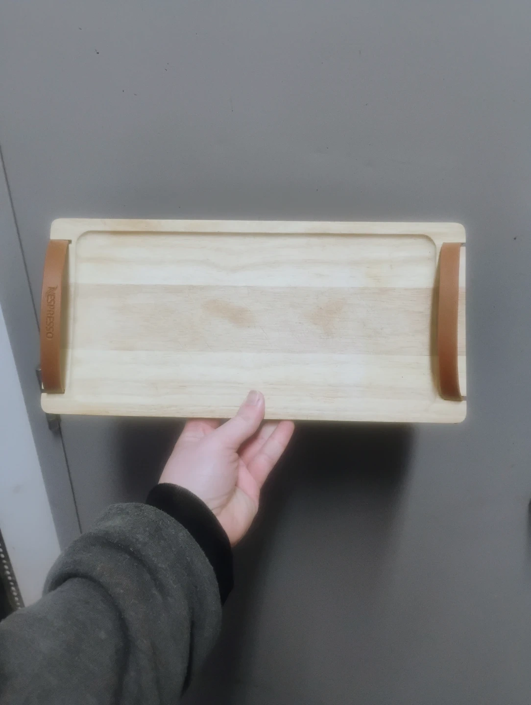 This Nespresso serving tray is made from light-coloured wood. It features easy-to-grip brown leather handles on each end. Perfect for serving drinks or snacks.