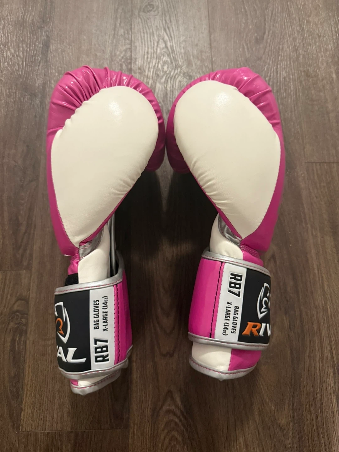 These Rival RB7 bag gloves are X-Large and 14oz. They are designed for training and feature a pink and white colour scheme. The gloves are made from synthetic leather.