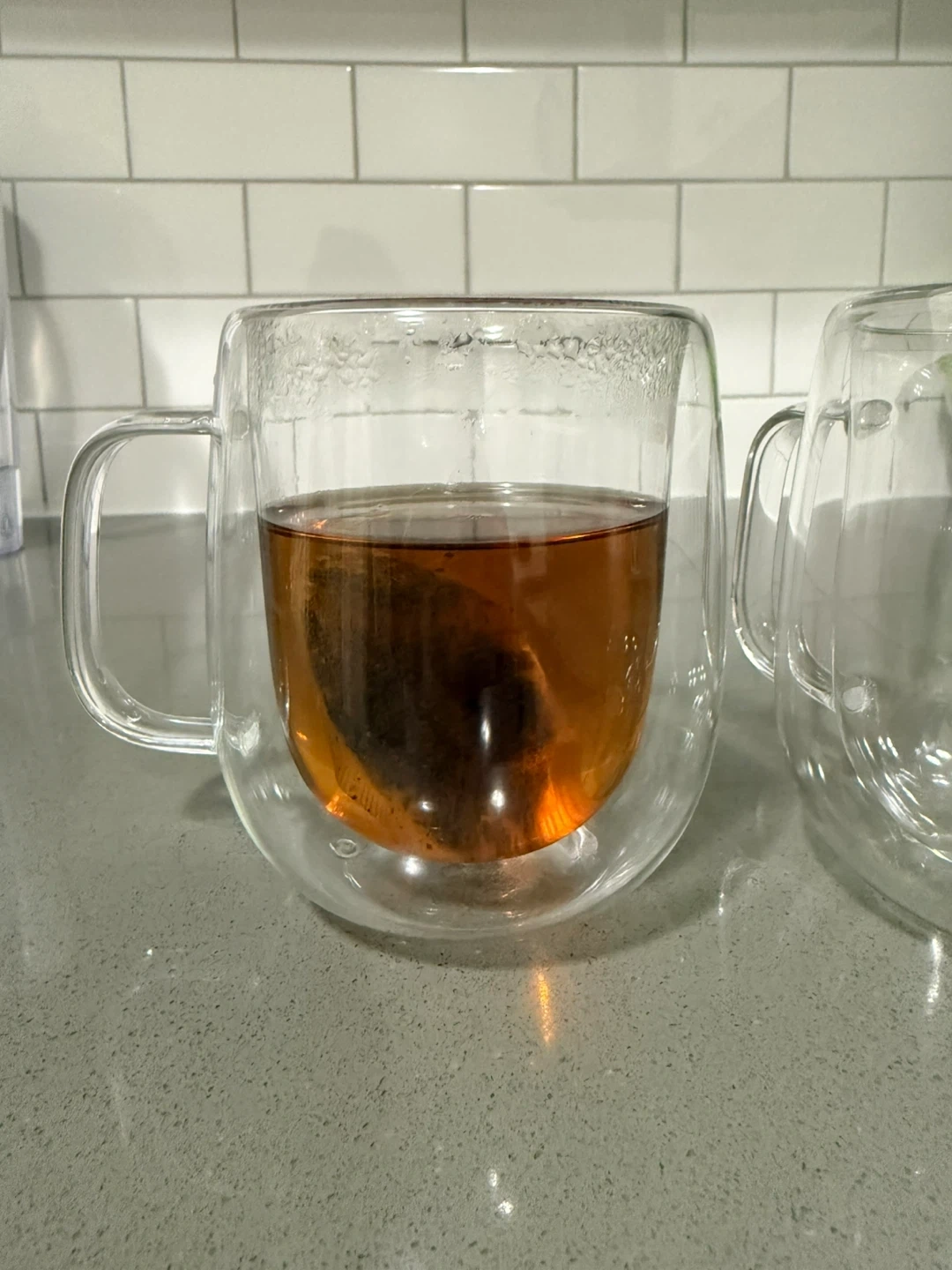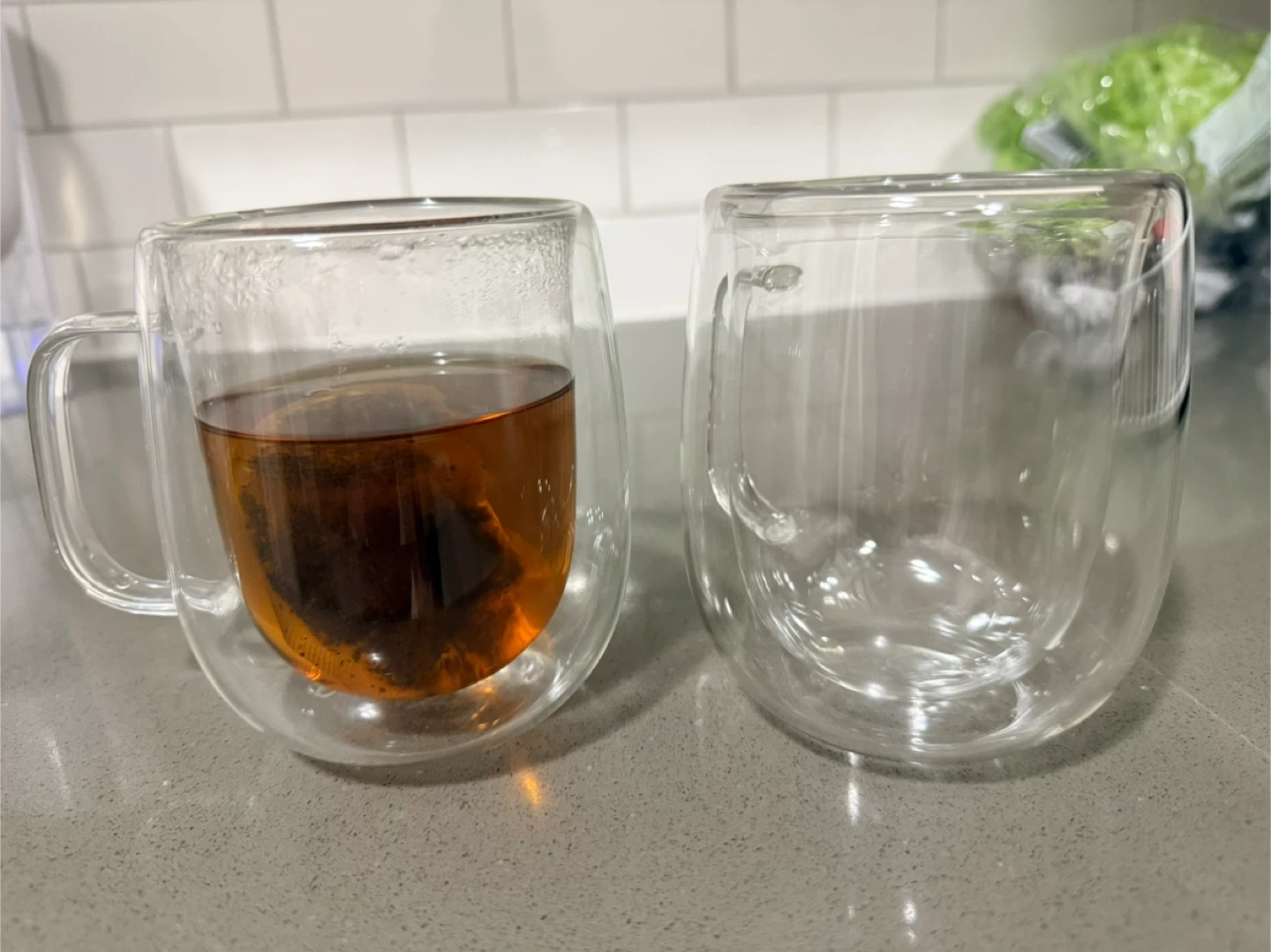 Two double-walled glass mugs with handles are included. One mug has tea brewing inside, showing its capacity. 300ml