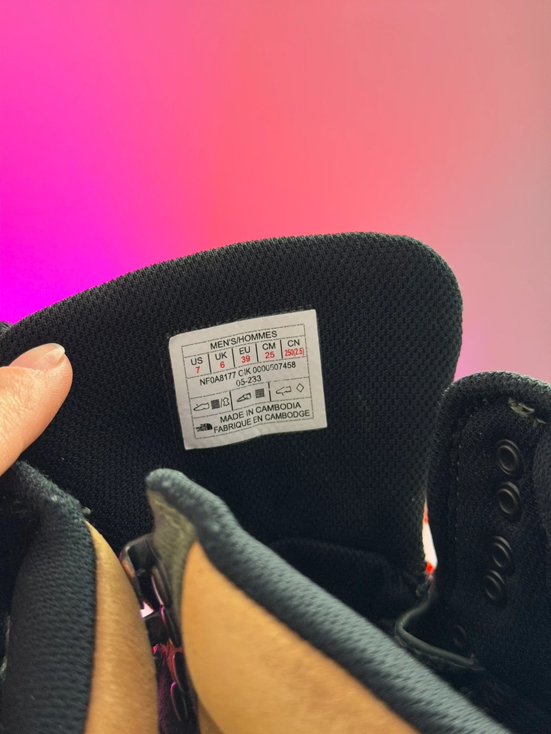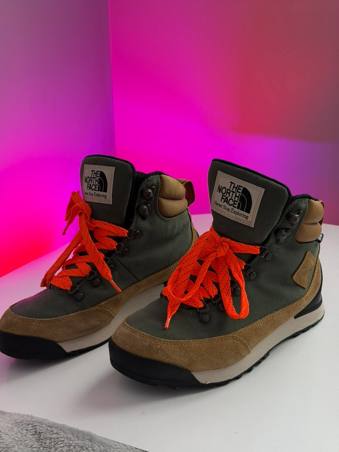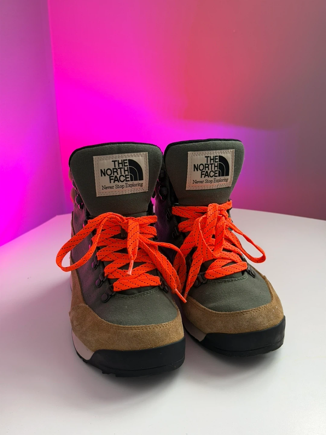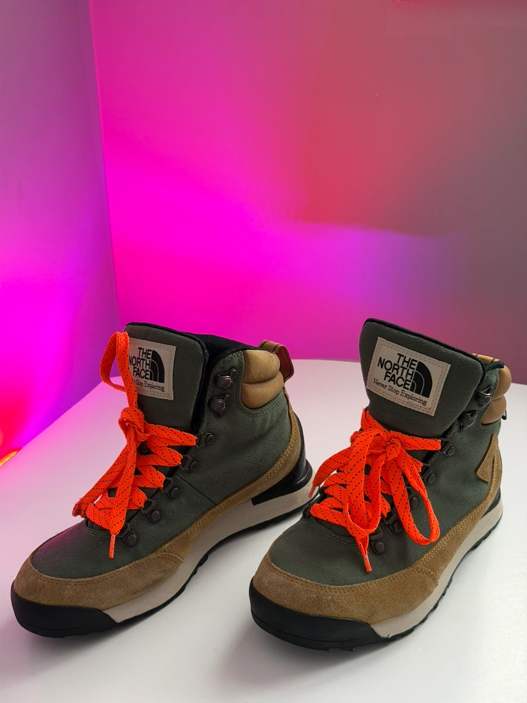 These North Face hiking boots are designed for comfort and durability. They feature a green canvas and brown suede upper with bright orange laces. Perfect for your next outdoor adventure!