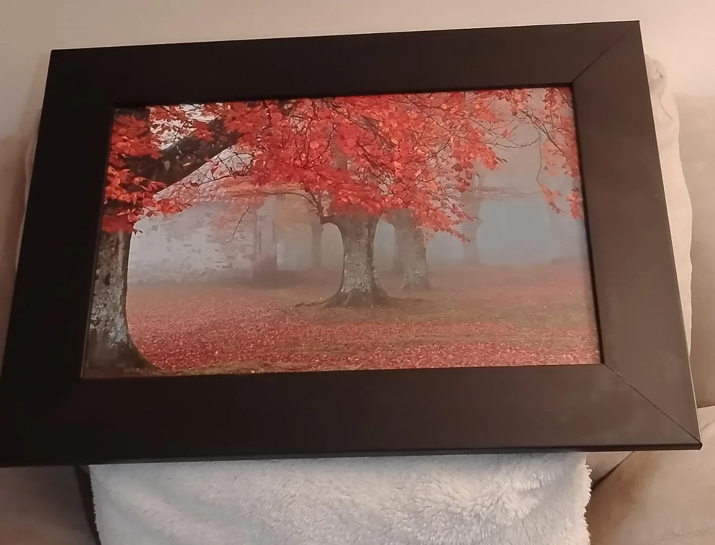 This framed print features a beautiful autumn landscape with trees covered in red leaves and a misty background. It's housed in a dark frame, ready to hang. The scene depicts a forest floor covered in fallen leaves.