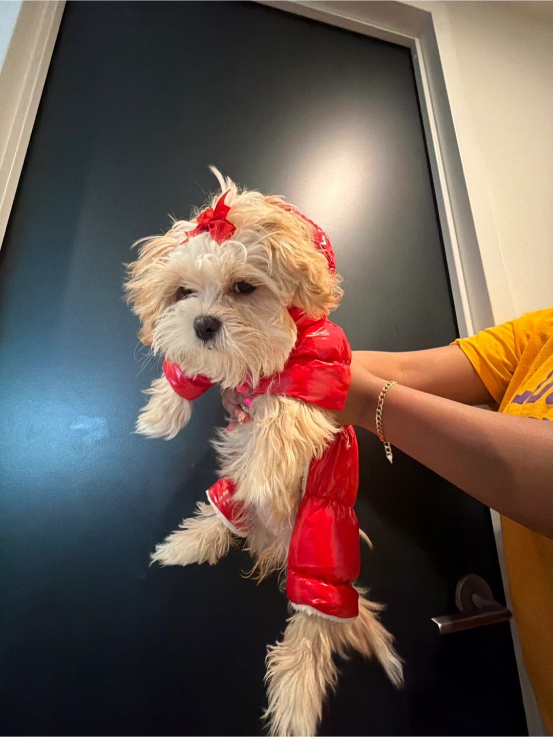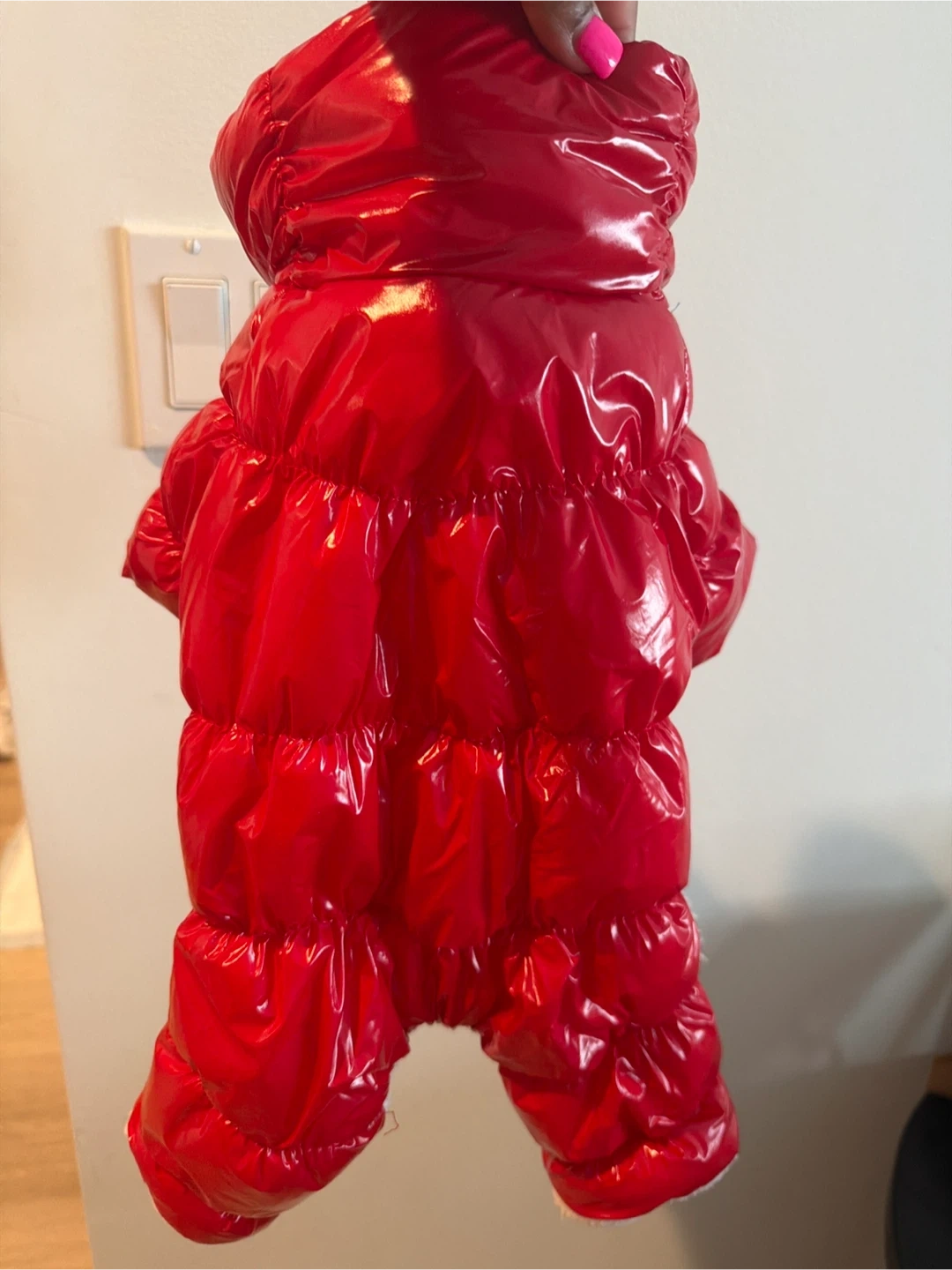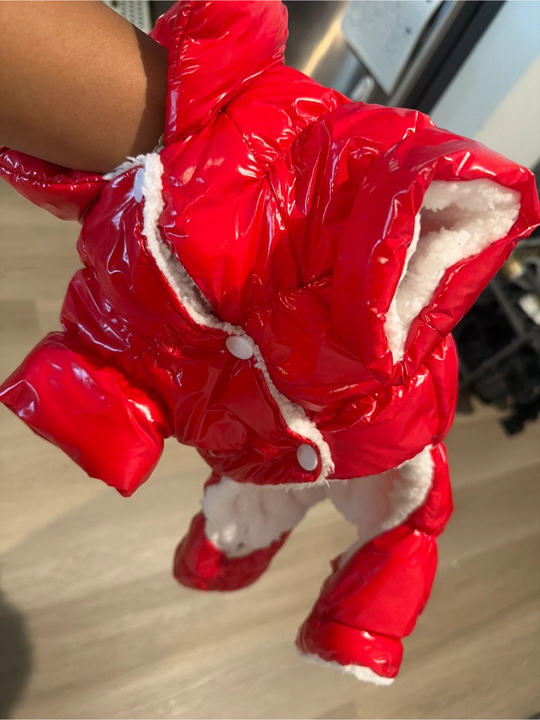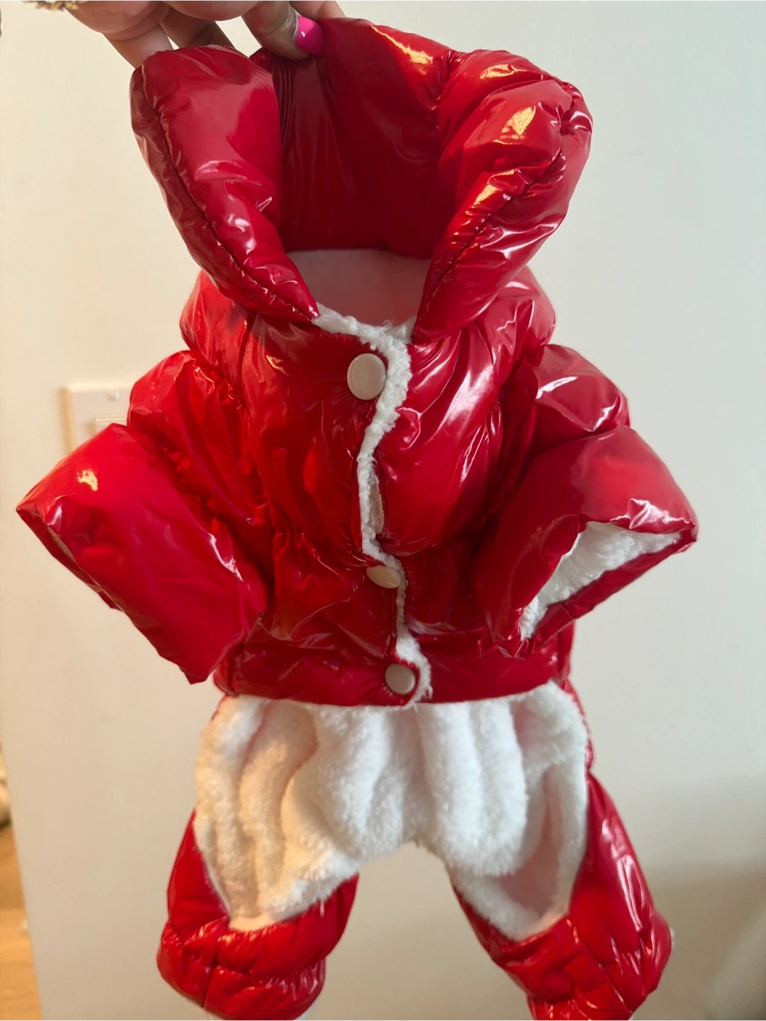 Super cute and warm red shiny puffer coat for your dog. It's lined with soft white fluffy for extra comfort. Features snap buttons down the front for easy on and off. Keeps your furry friend cozy during cold weather!