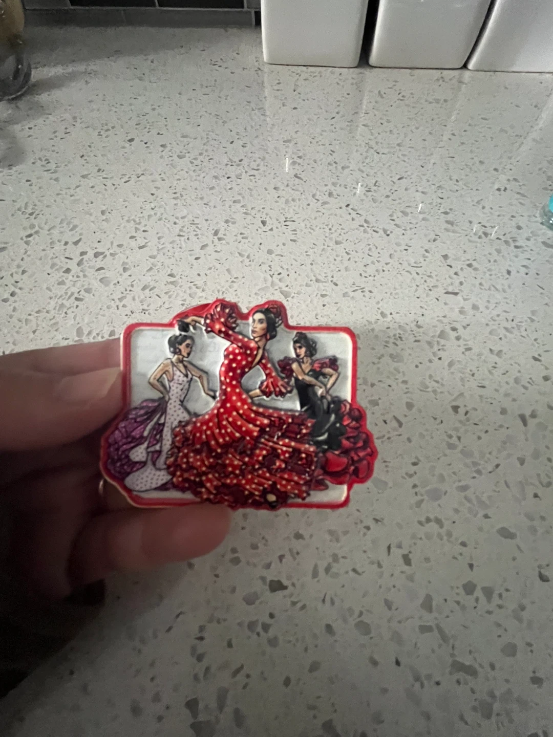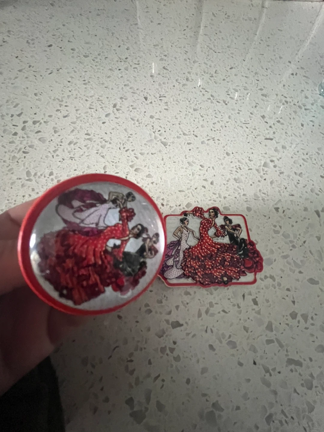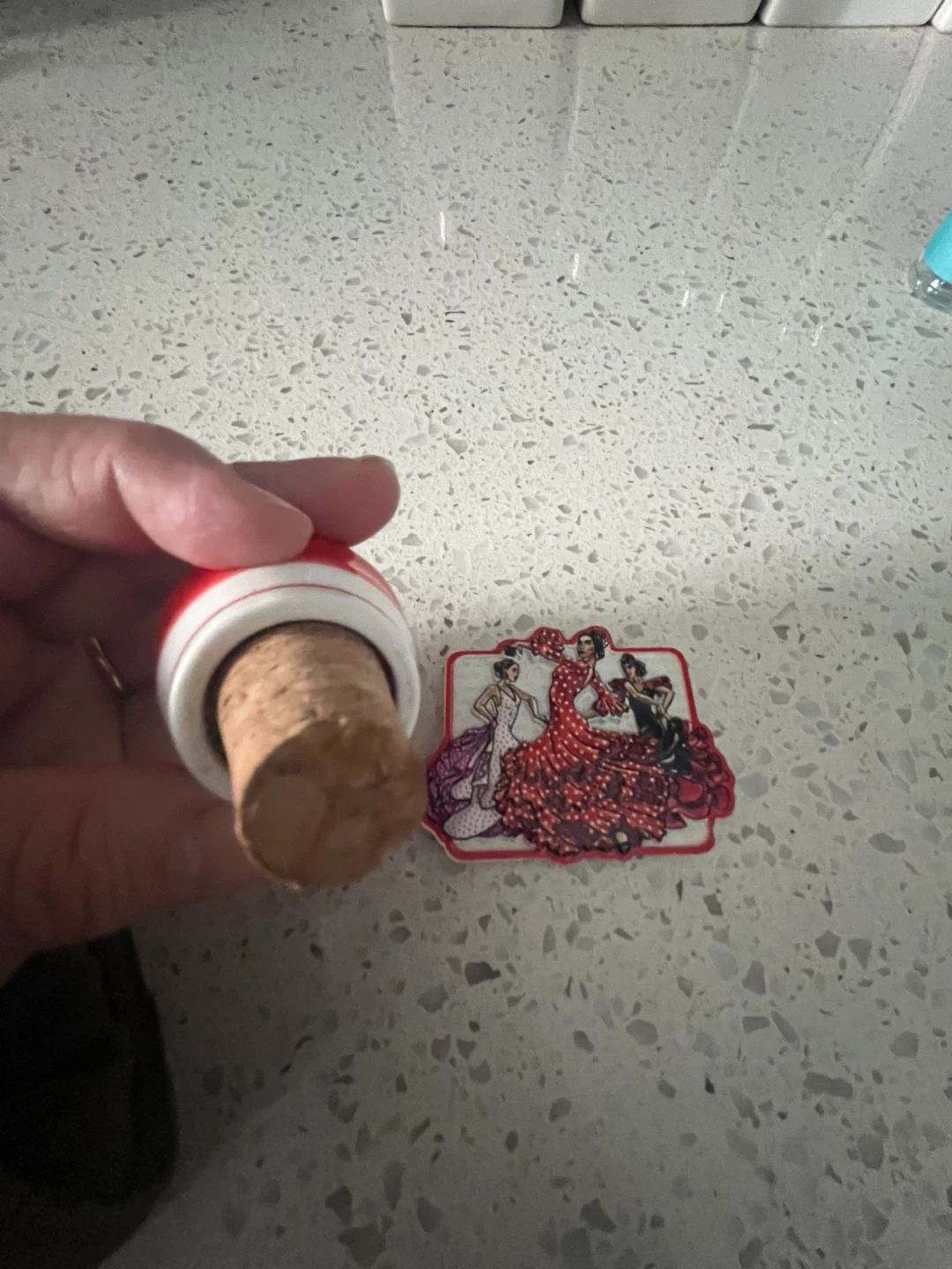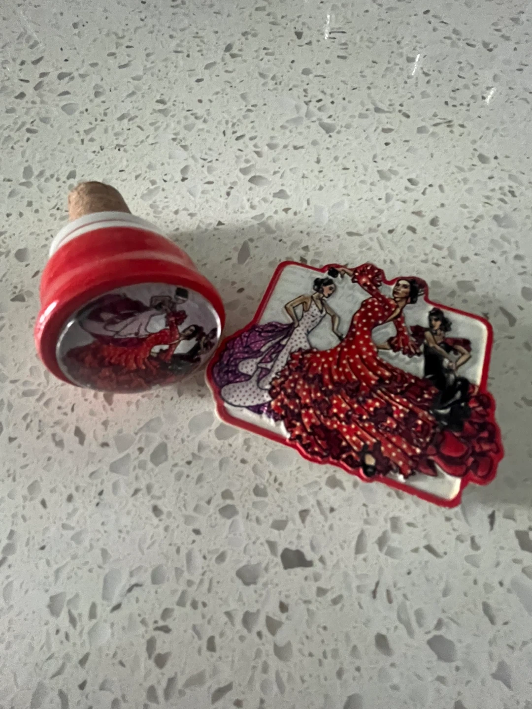 This decorative bottle stopper features three flamenco dancers. It has a cork base and a red and white ceramic top with a detailed illustration and a magnetic . Perfect for keeping your opened wine or spirits fresh!