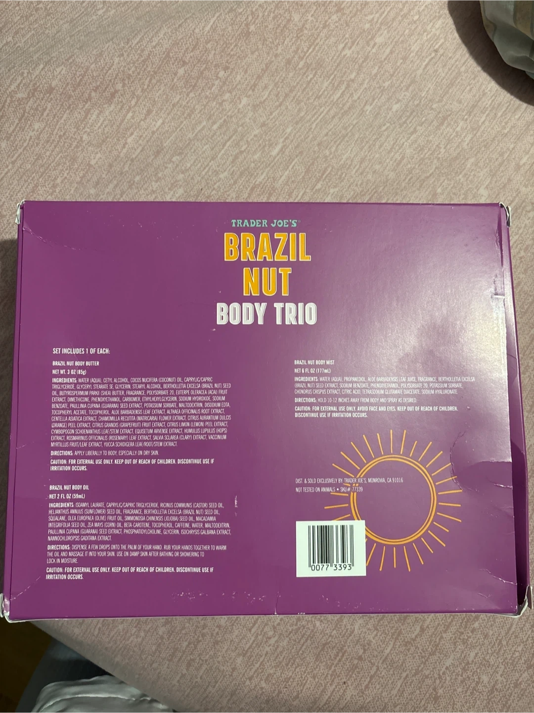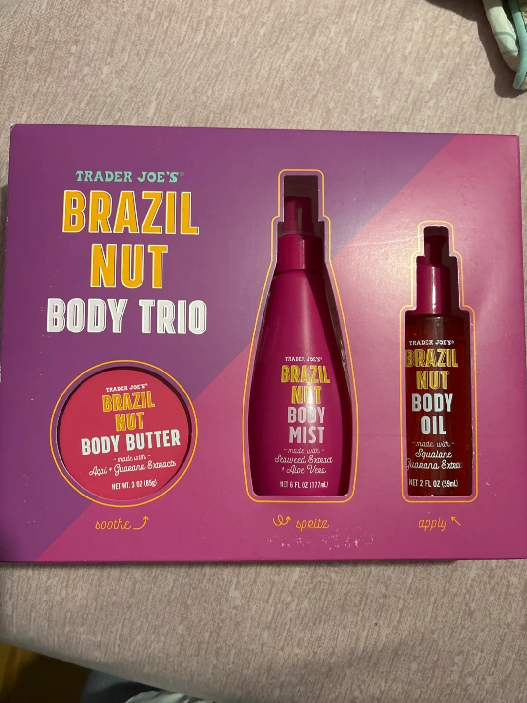 This set includes a Brazil Nut Body Butter (85g), Brazil Nut Body Mist (177ml), and Brazil Nut Body Oil (59ml). The body butter is made with Açaí & Guarana extracts. The body mist is made with Seaweed Extract & Aloe Vera. The body oil is made with Brazil Nut Oil.