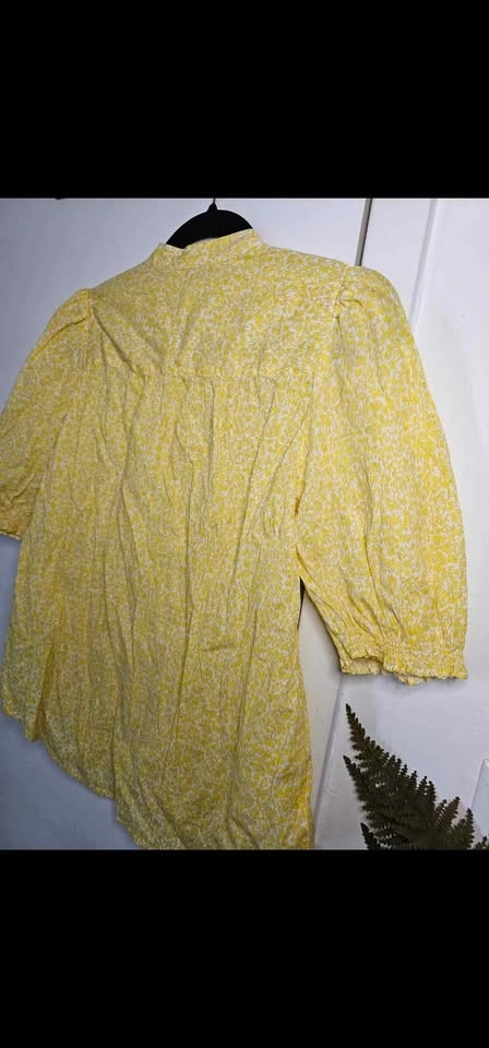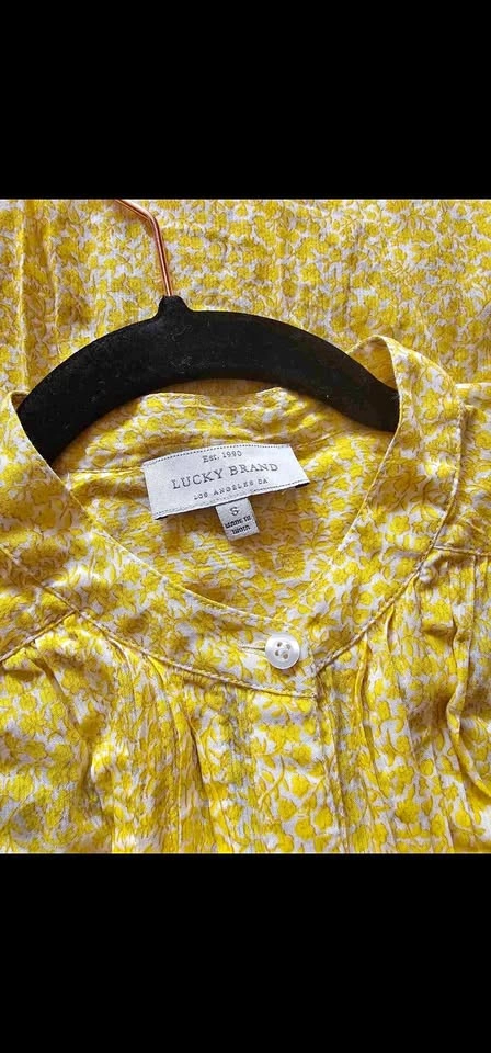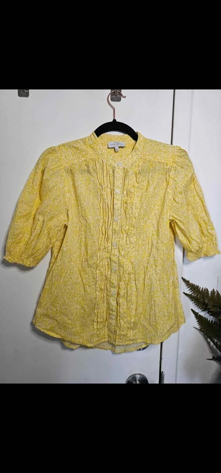 Cheery and cute short sleeve button-up top from Lucky Brand, in a dainty yellow and white floral pattern. Shirt has puffed sleeves and ruching at the sleeve hems, a round neck, pintuck seams down the front, and small glossy white buttons to close it. Top has a looser fit.