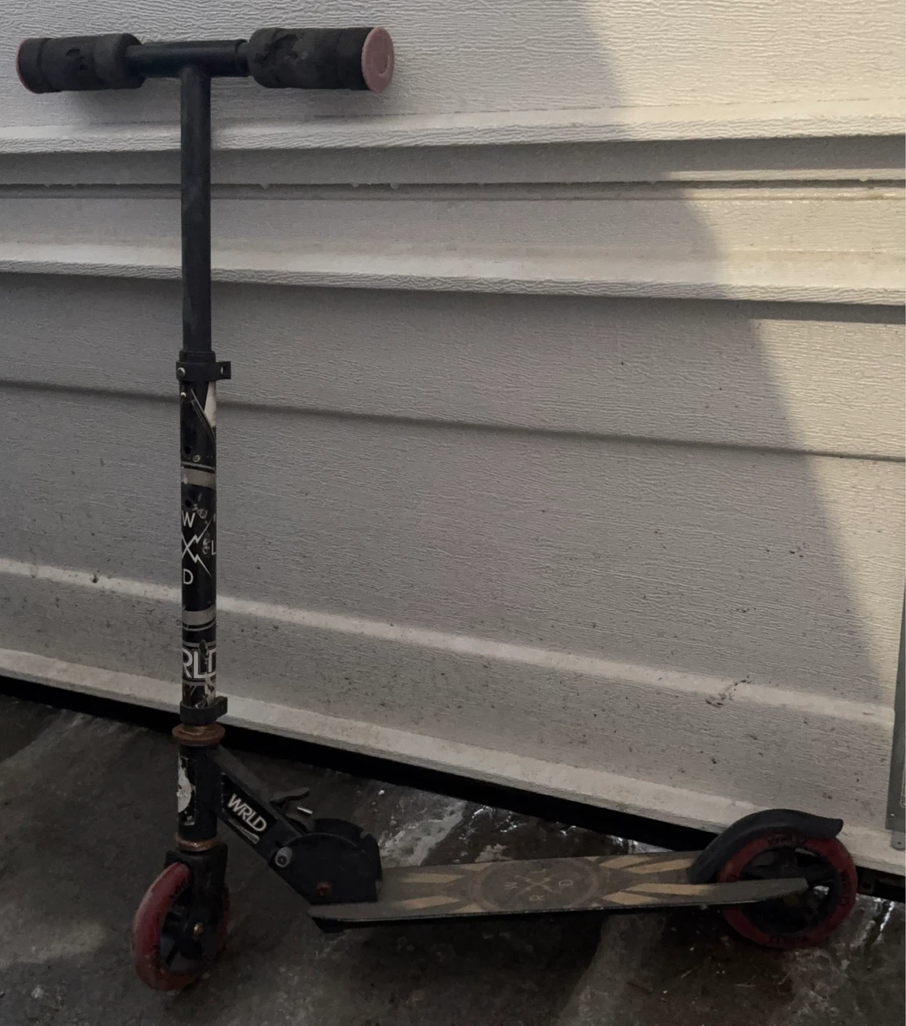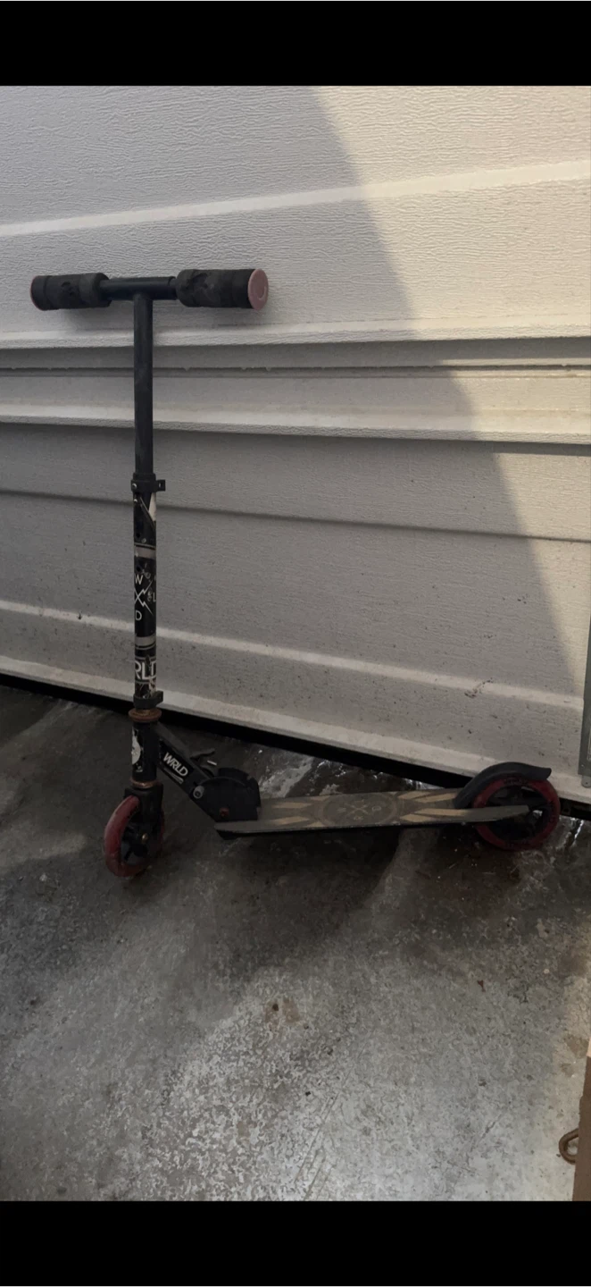 Selling a used WRLD stunt scooter. It shows signs of wear and tear, but is still functional for tricks and getting around