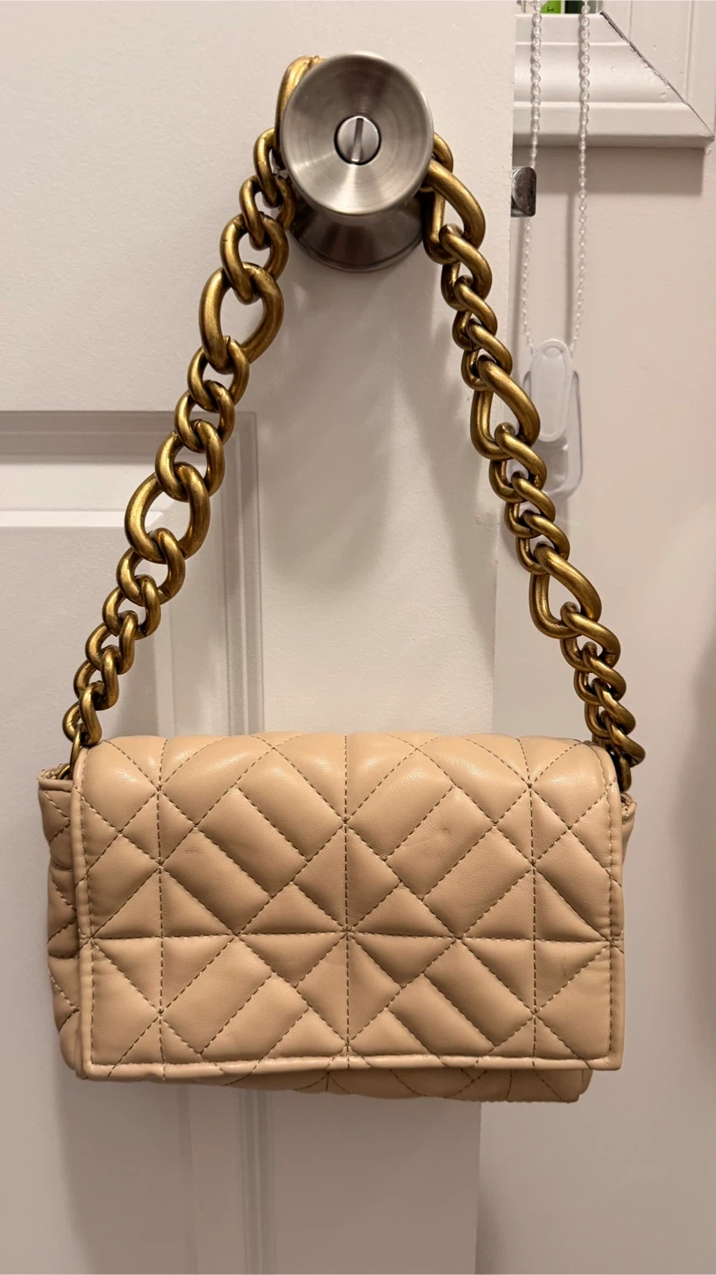Quilted shoulder bag in a neutral beige tone. Features a thick gold-tone chain strap. A stylish accessory for any outfit!