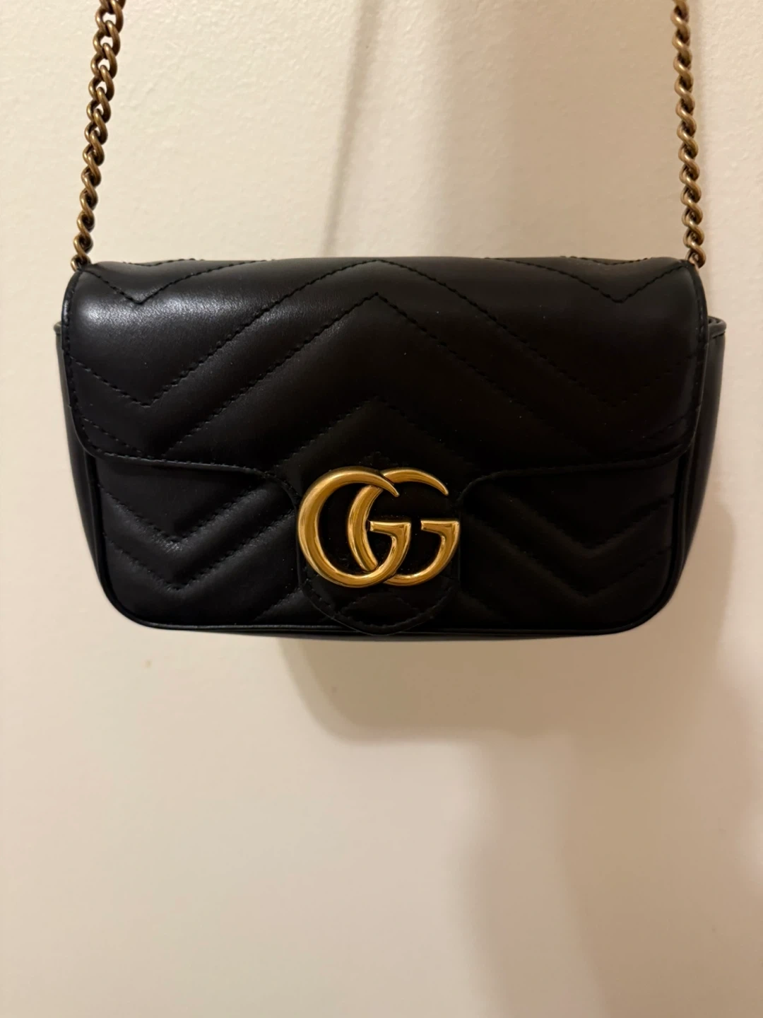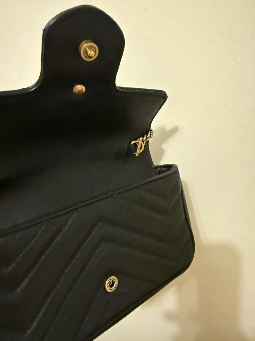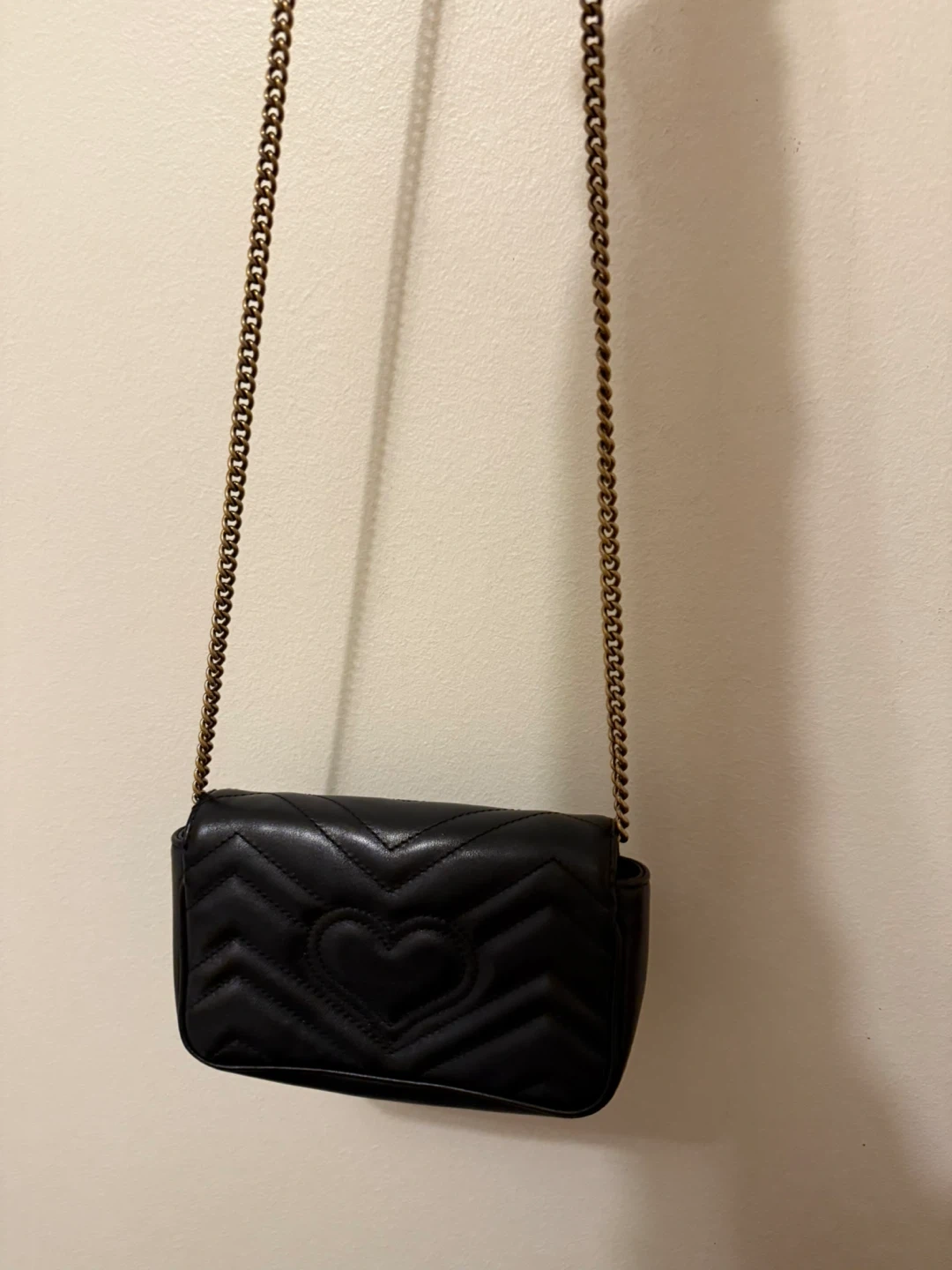 A black Gucci Marmont mini bag. It's made of quilted leather with a gold GG logo and chain strap. Features a heart detail on the back.