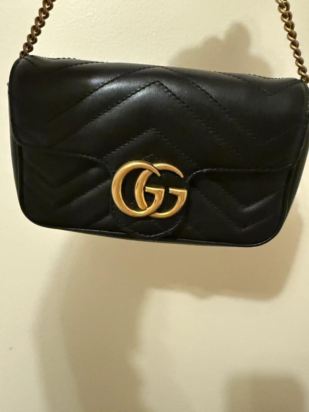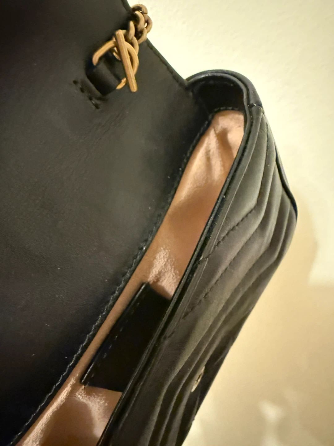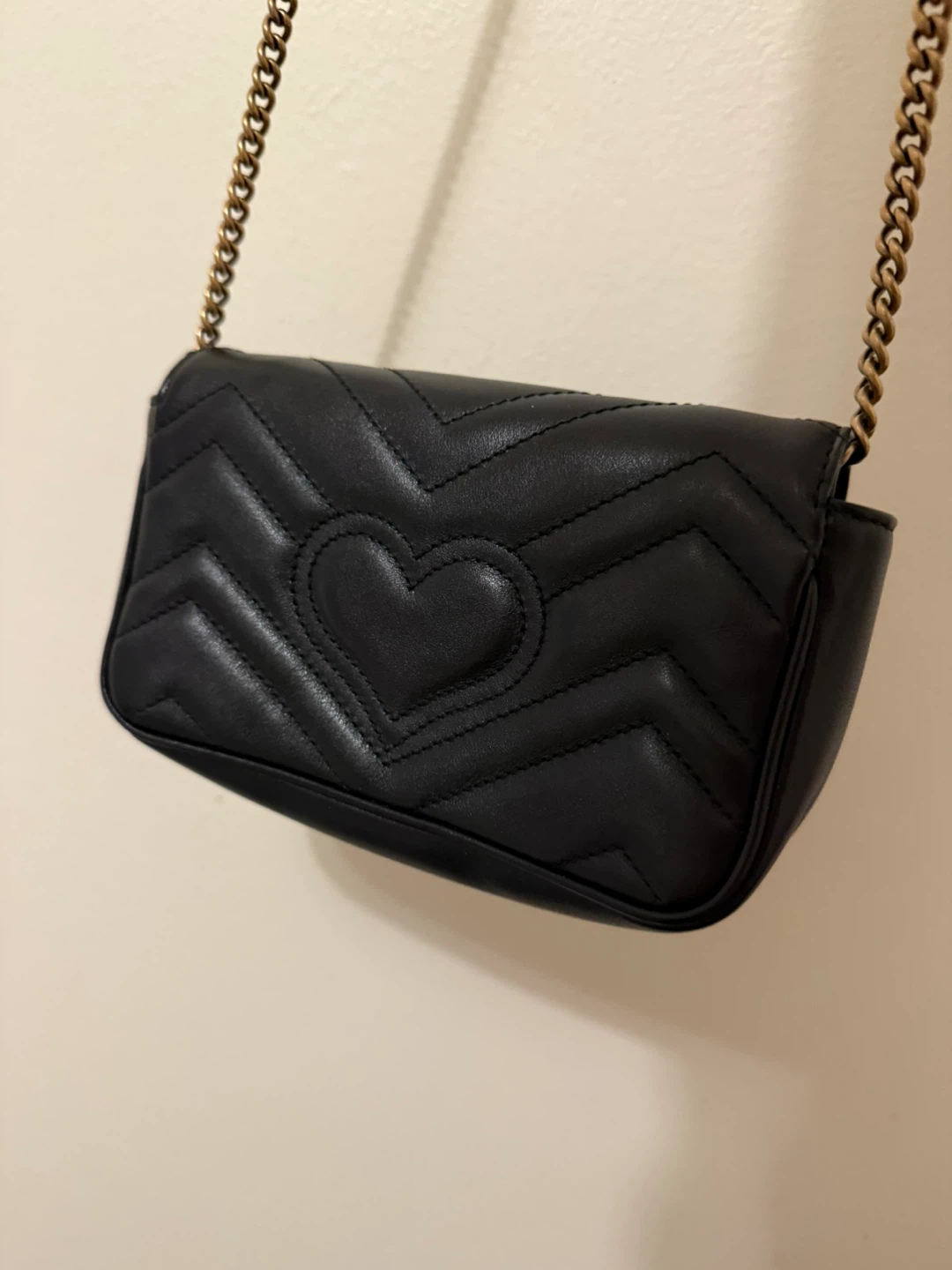 A black Gucci Marmont mini bag. It's made of quilted leather with a gold GG logo and chain strap. Features a heart detail on the back.