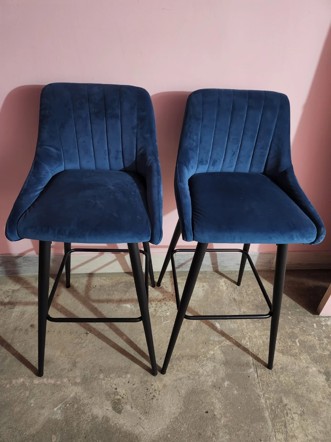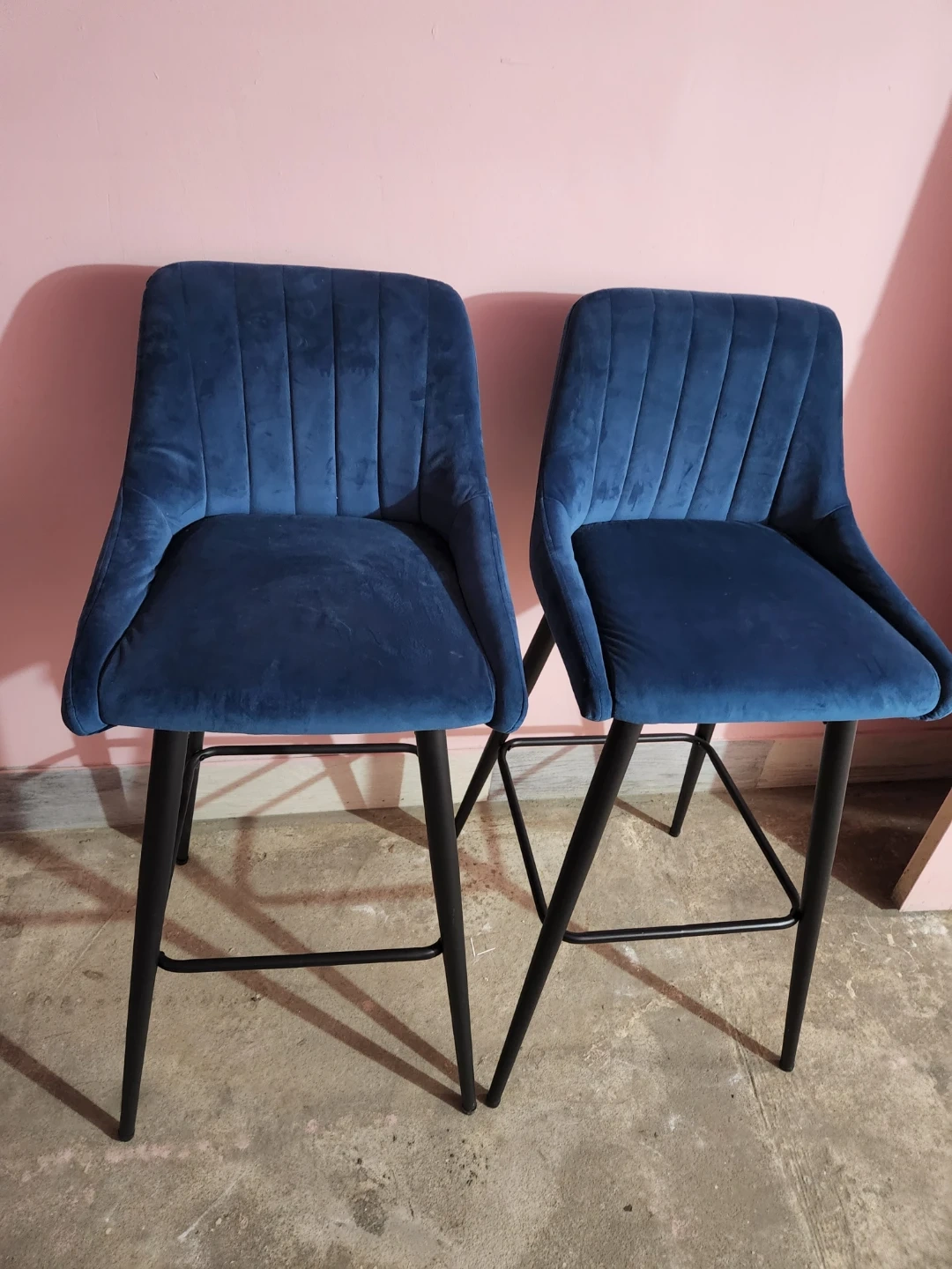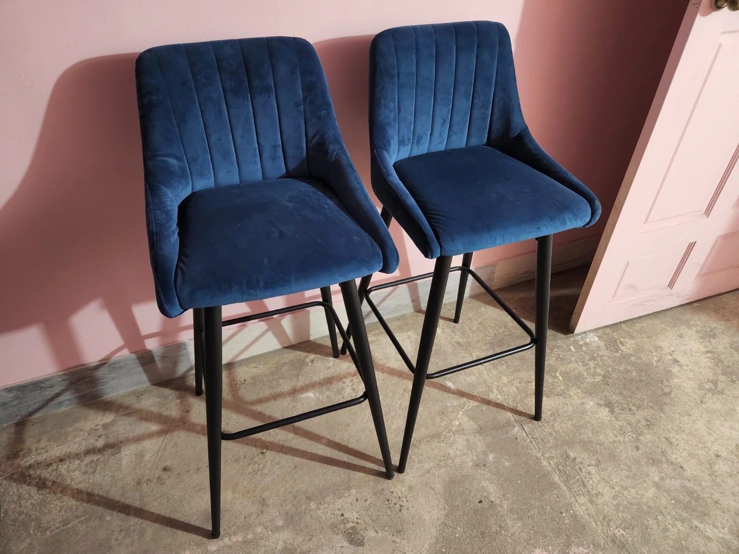 Set of two blue velvet bar stools with a channel tufted back. They have black metal legs.in great condition.cash only