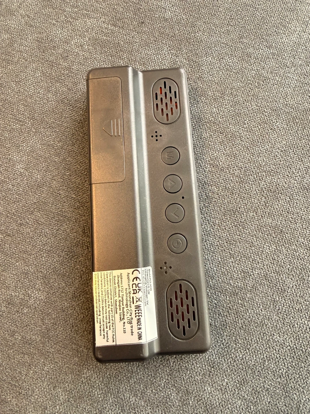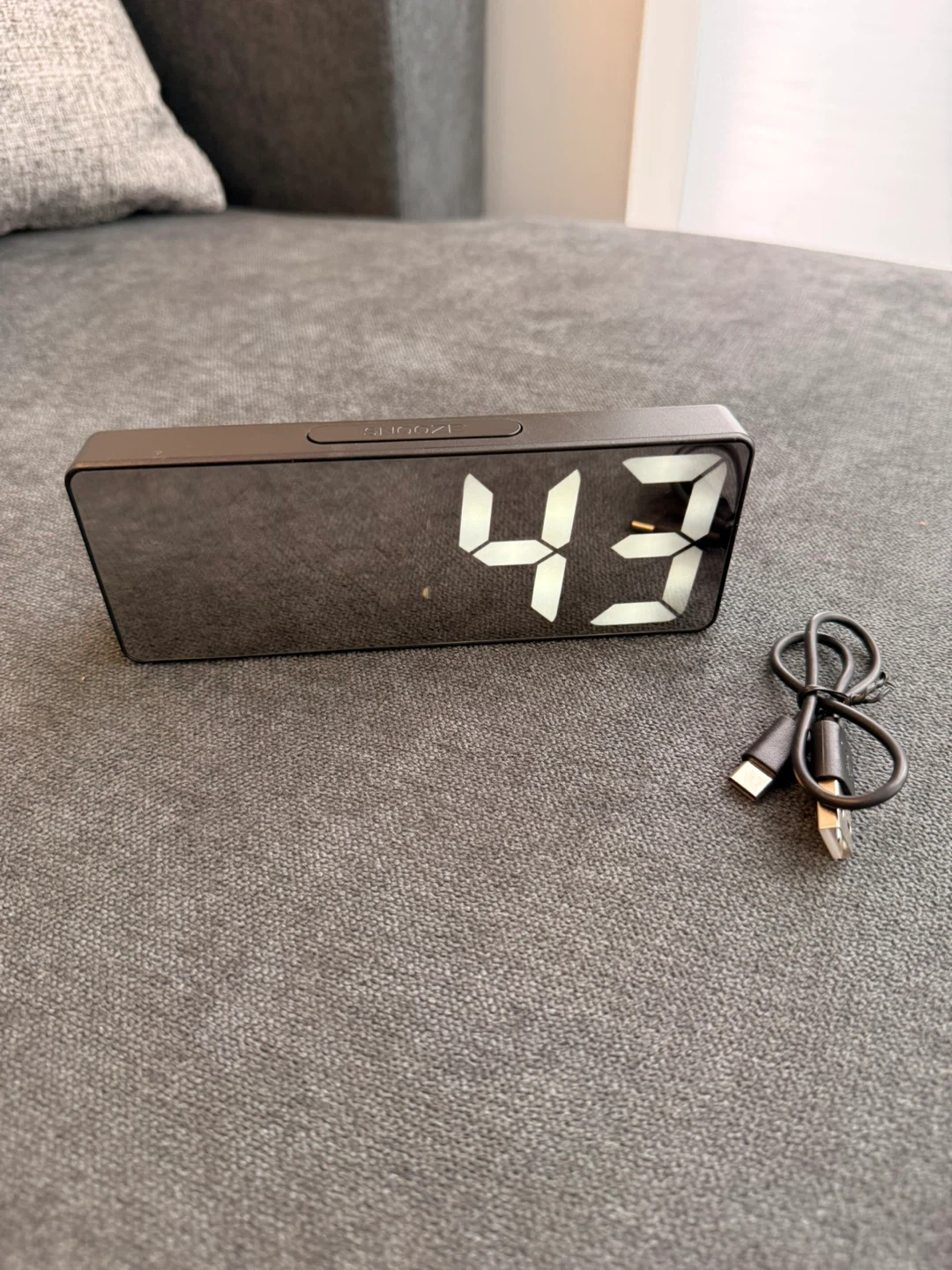 This digital alarm clock features a mirrored LED display. It comes with USB charging cables or you can use with 3 AAA batteries. The sleek design makes it a nice addition to any bedside table.