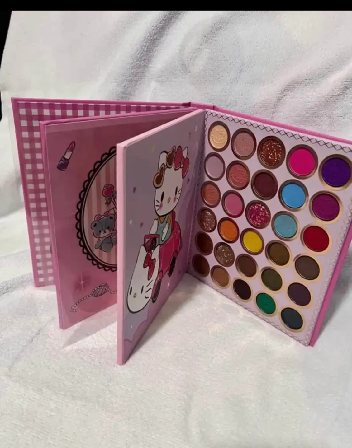 This eyeshadow palette features a fun Hello Kitty design. It opens like a book to reveal multiple colorful eyeshadow shades. Perfect for makeup enthusiasts who love cute aesthetics!