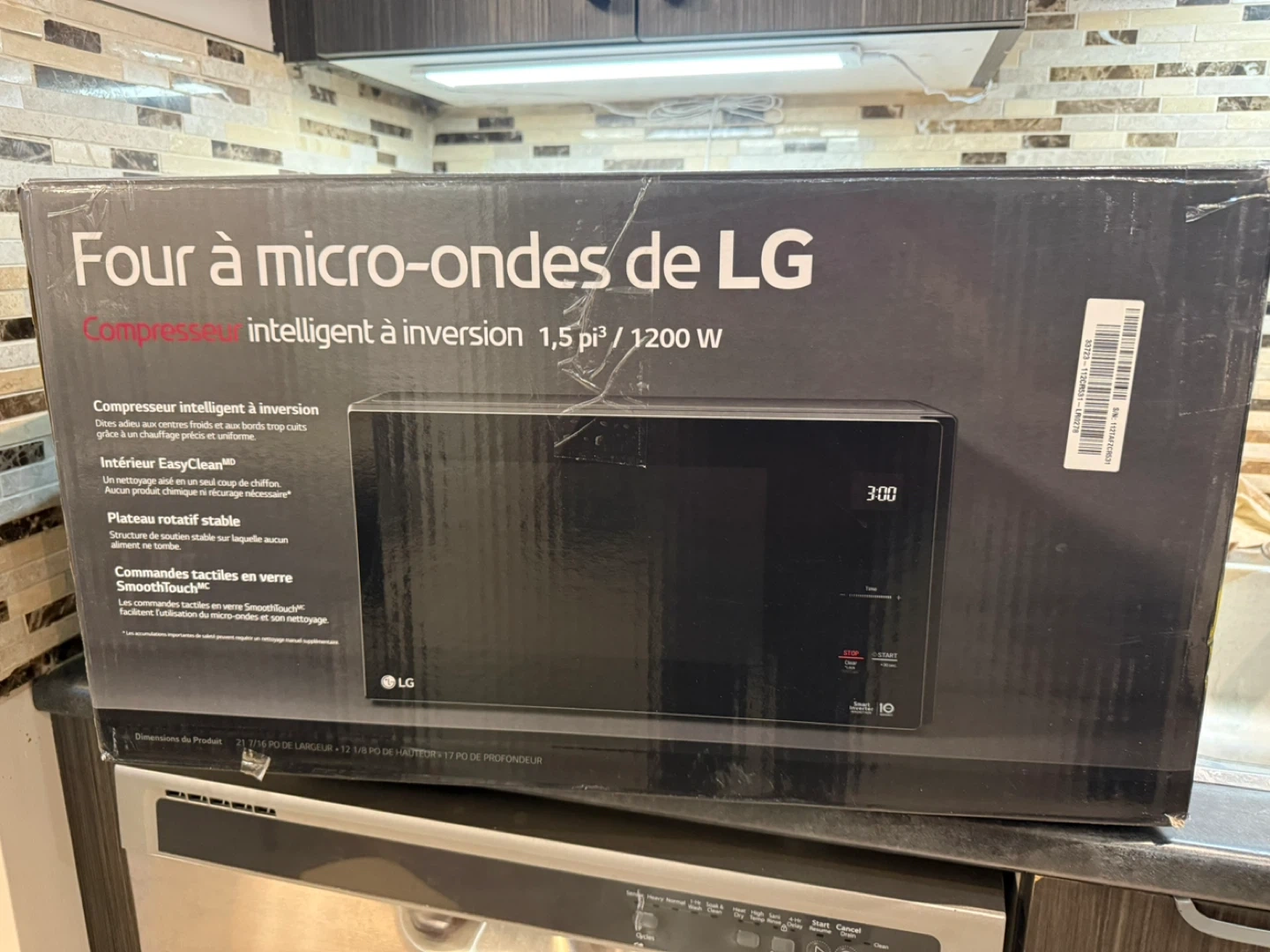 LG microwave with smart inverter technology and Easy Clean interior. It features a stable turntable and smooth touch controls. This appliance is 1.5 cubic feet with 1200W power.
