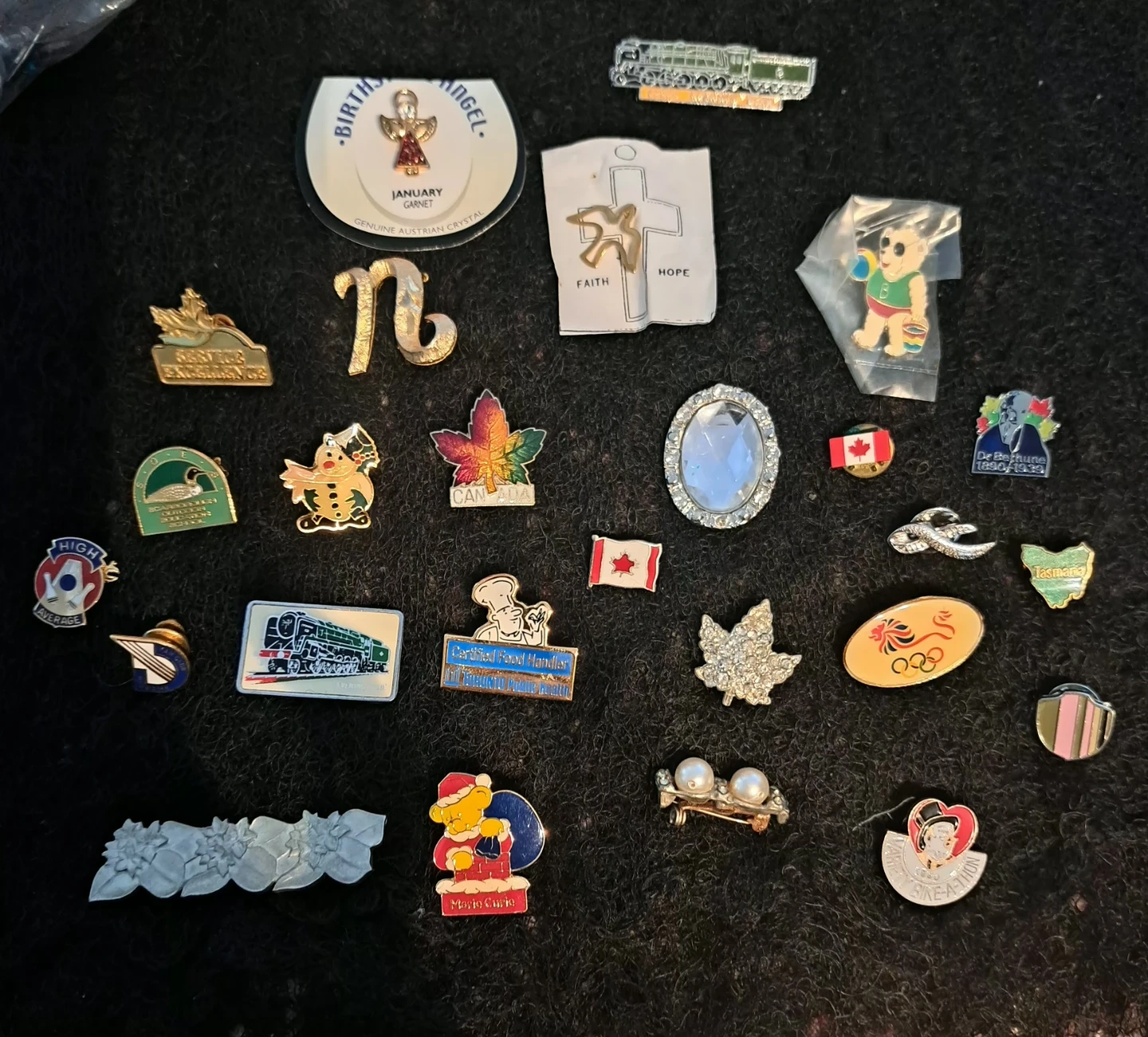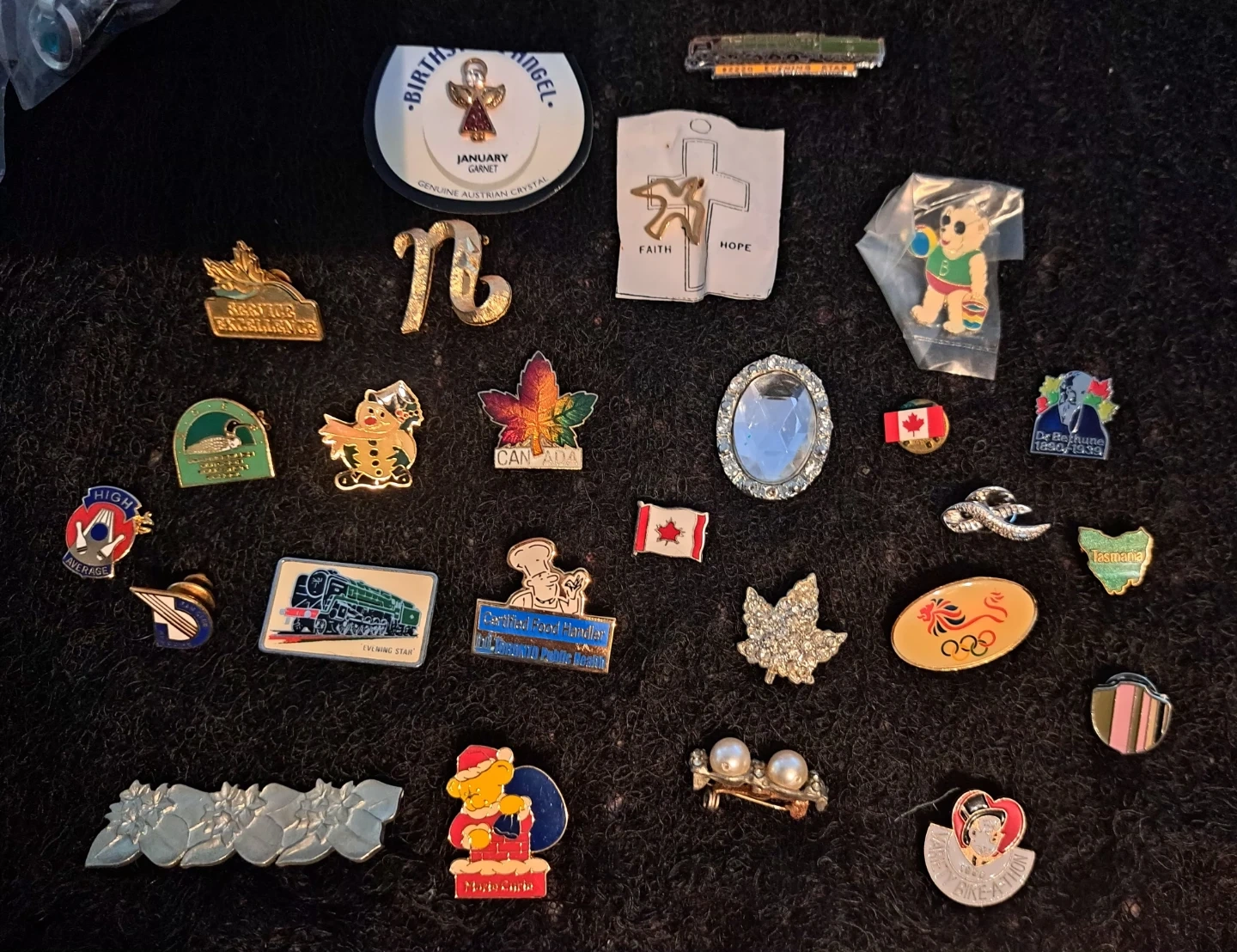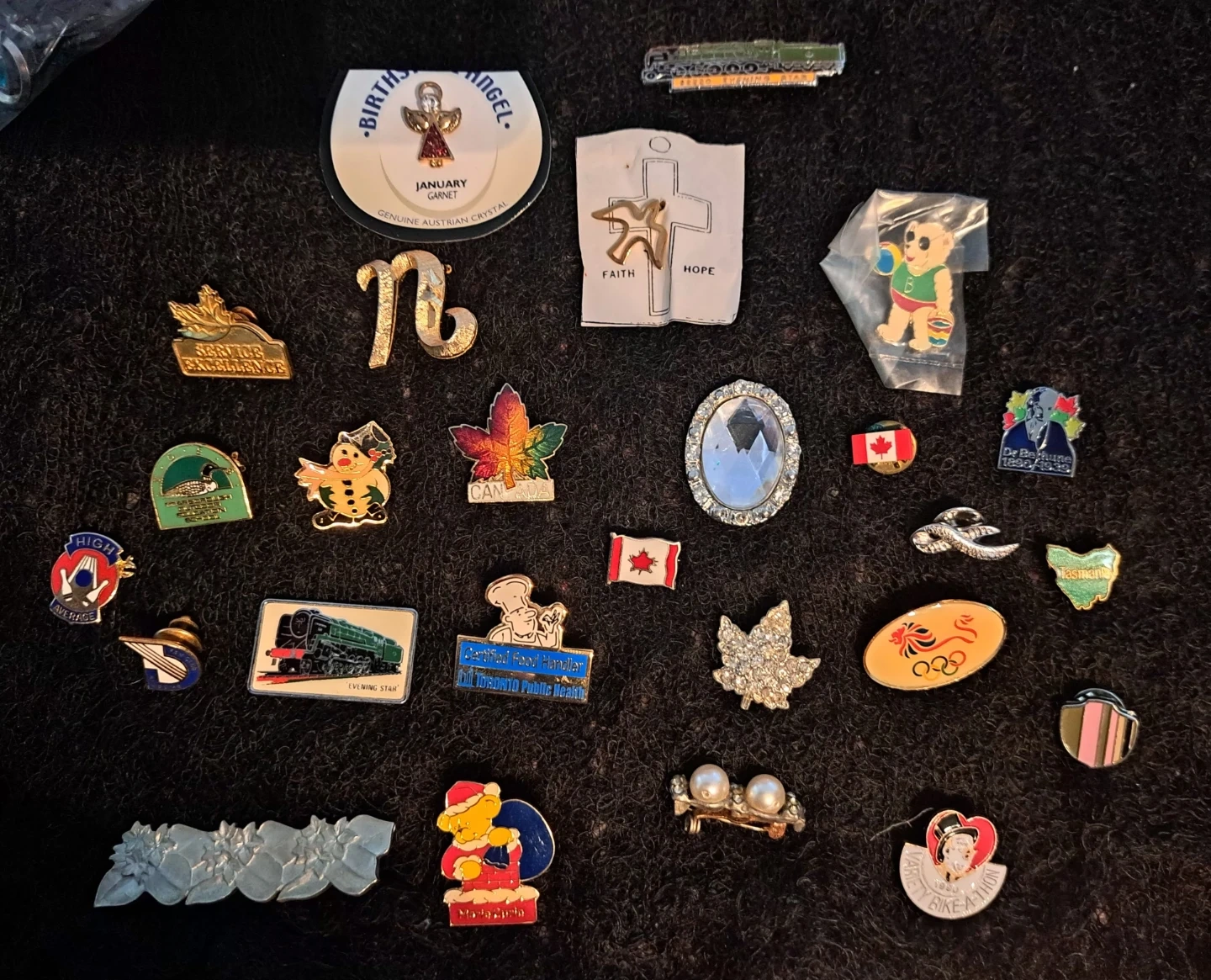 This collection features a variety of enamel pins, including Canadian-themed designs like maple leaves and flags, as well as a few novelty and Olympic pins. Great for collectors! Total 25 pins.