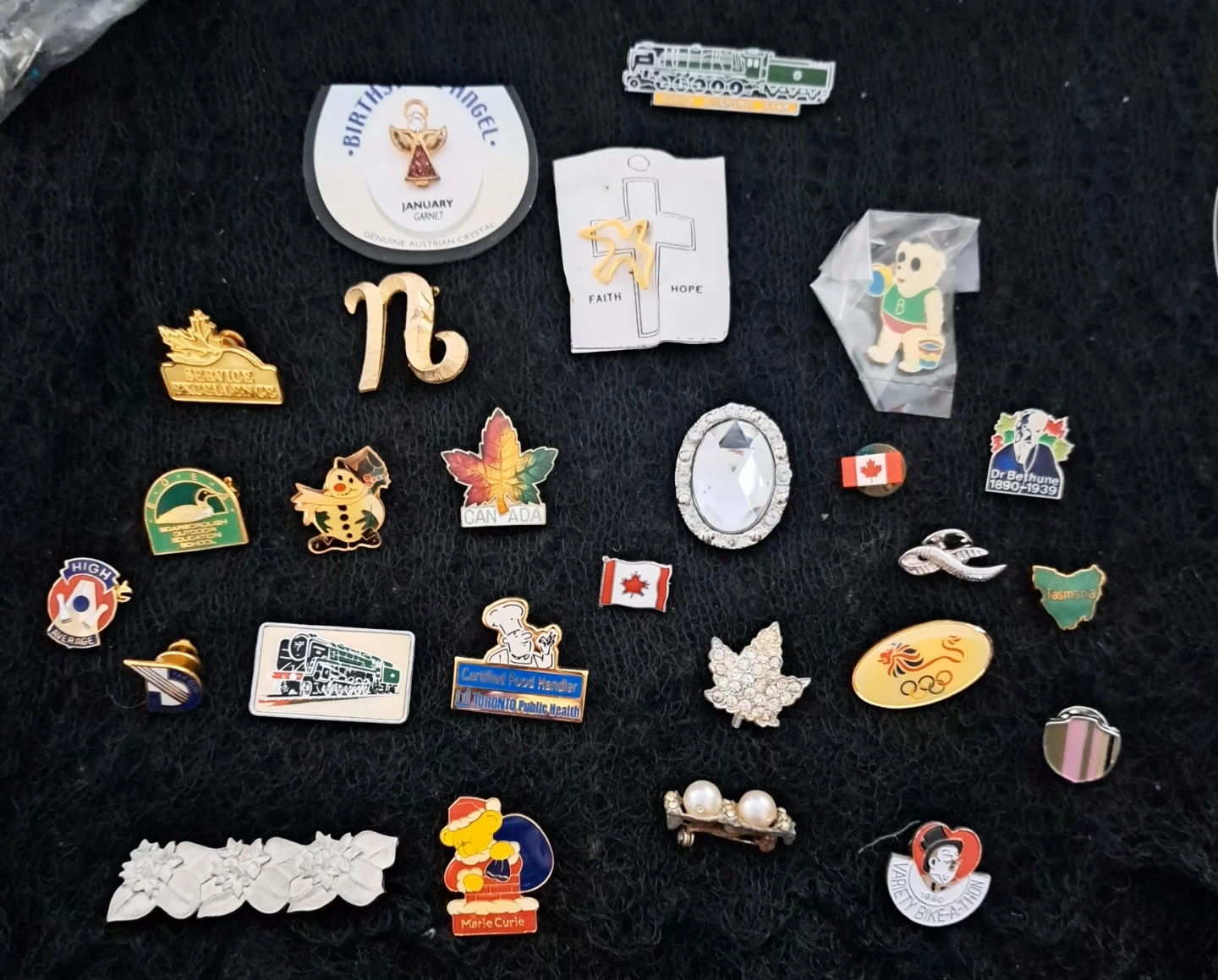 This collection features a variety of enamel pins, including Canadian-themed designs like maple leaves and flags, as well as a few novelty and Olympic pins. Great for collectors! Total 25 pins.