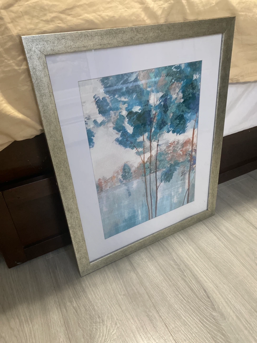 This framed wall art features a serene blue tree landscape scene. The picture is housed in a silver-toned textured frame. It's ready to hang and would add a touch of nature to any room.